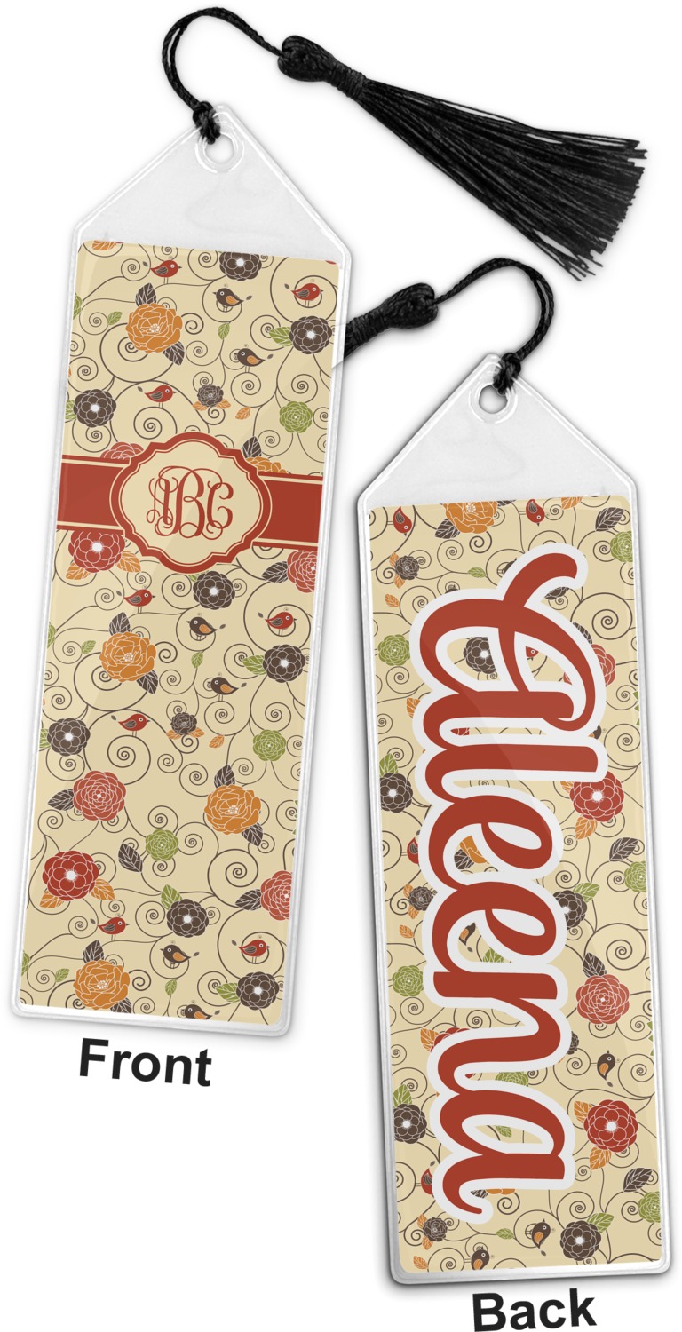 Your personalized bookmark is made of a sturdy, clear vinyl, and is approximately 7.5" x 2.25". We display your personalization on vinyl inserts that are placed on both sides. Accompanying each book marker is a black, fringe tassel that attaches to the reinforced, triangular header.
