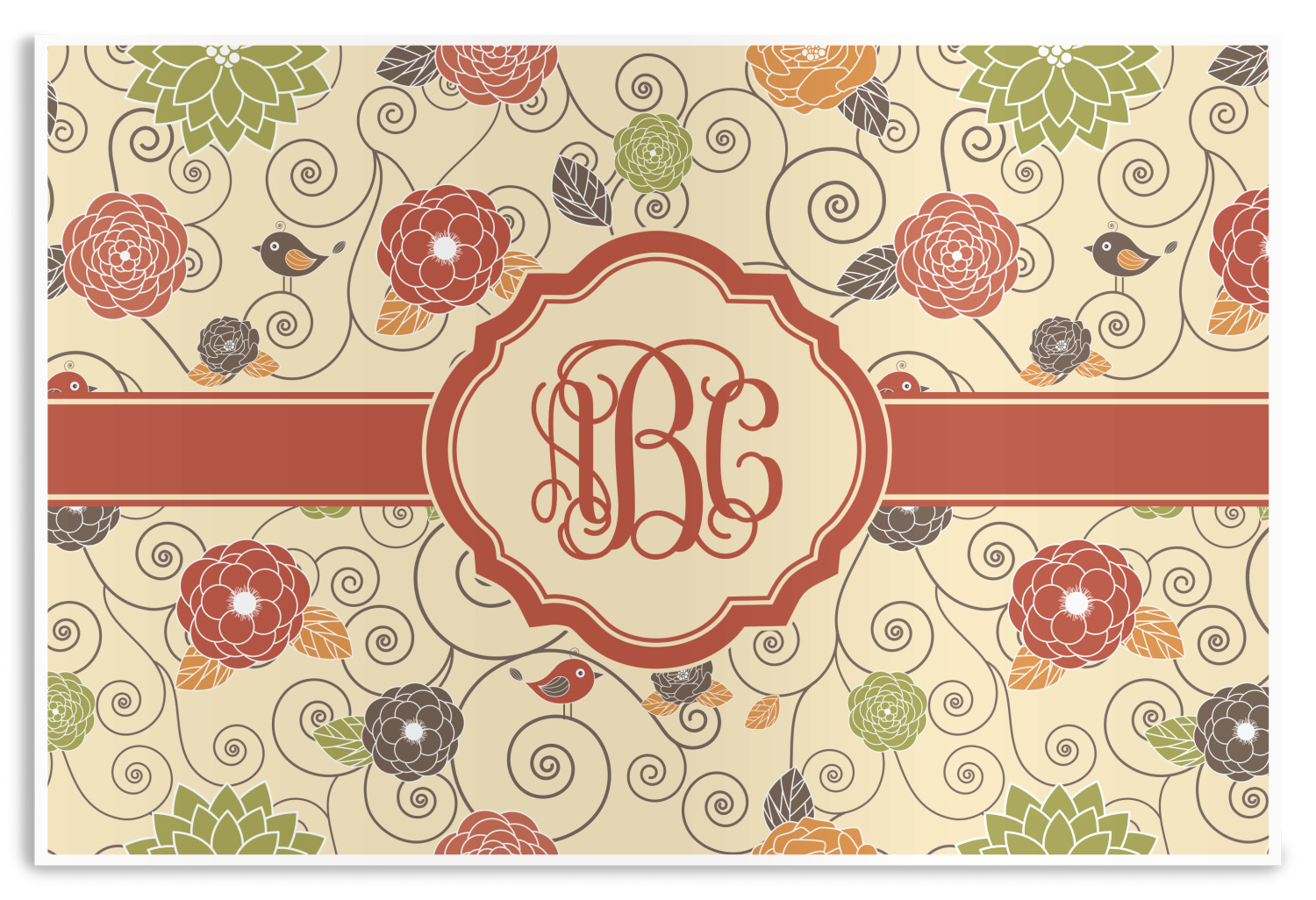 Autumn is in the air. You can feel the cool fall breeze when you see the sweet little song bird hidden amidst the fall foliage of red, orange, brown and green on a tan background. This fall flower design has chrysanthemums, asters, roses and beautiful set amongst swirls and curls.