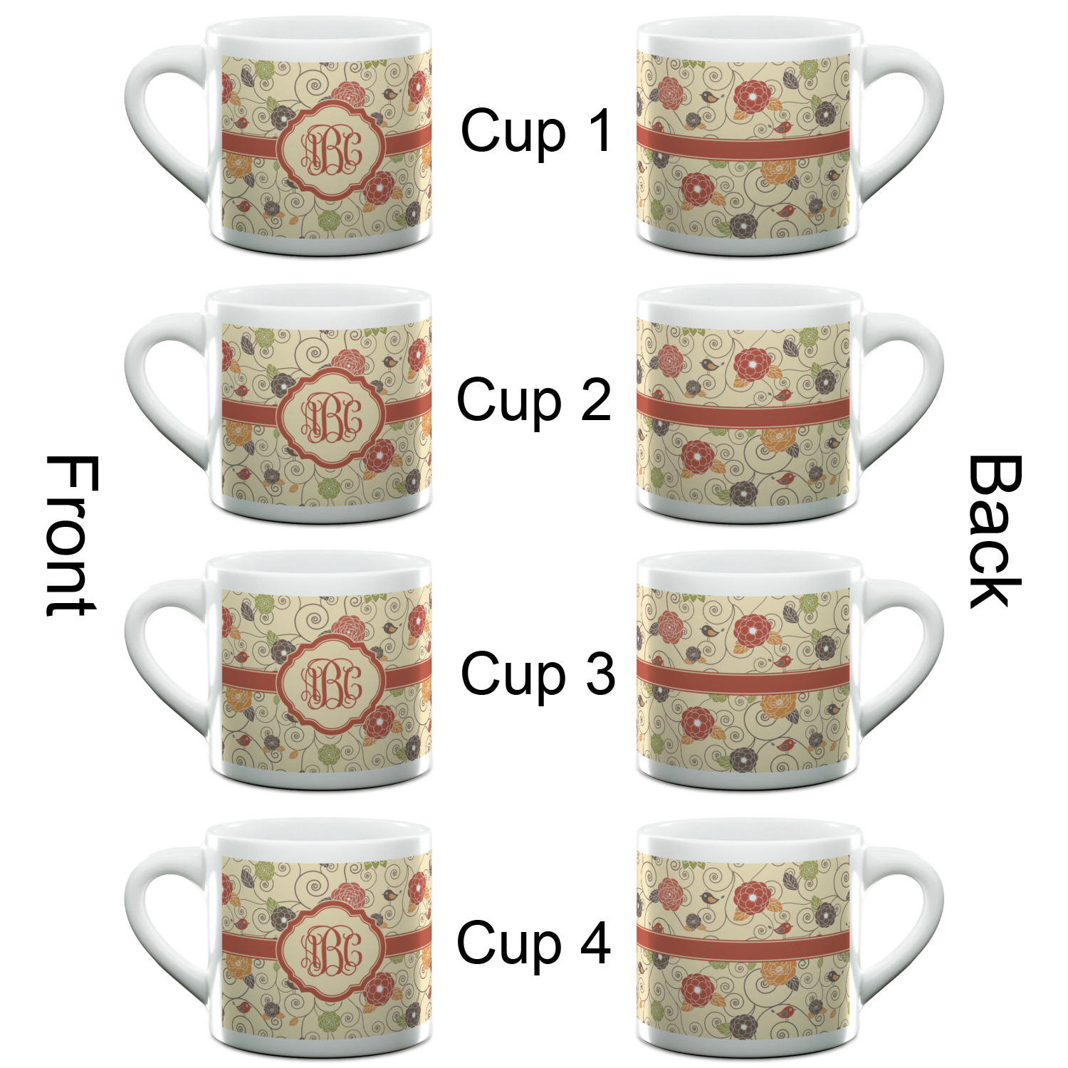 Each of our espresso mugs is a ceramic material sure to keep your drink warm. Personalize one cup for yourself, or order a set of 4! Its the perfect little gift for any coffee lover! We carry two sizes for you to personalize - 3 oz. (approx. 3.25" x 2.325" x 2.625") or 6 oz. (approx. 4" x 2.9" x 2.9"). Our 3 oz. mug is perfect for that single shot espresso while our 6 oz. mug can be your next favorite cappuccino cup holding two shots of espresso!