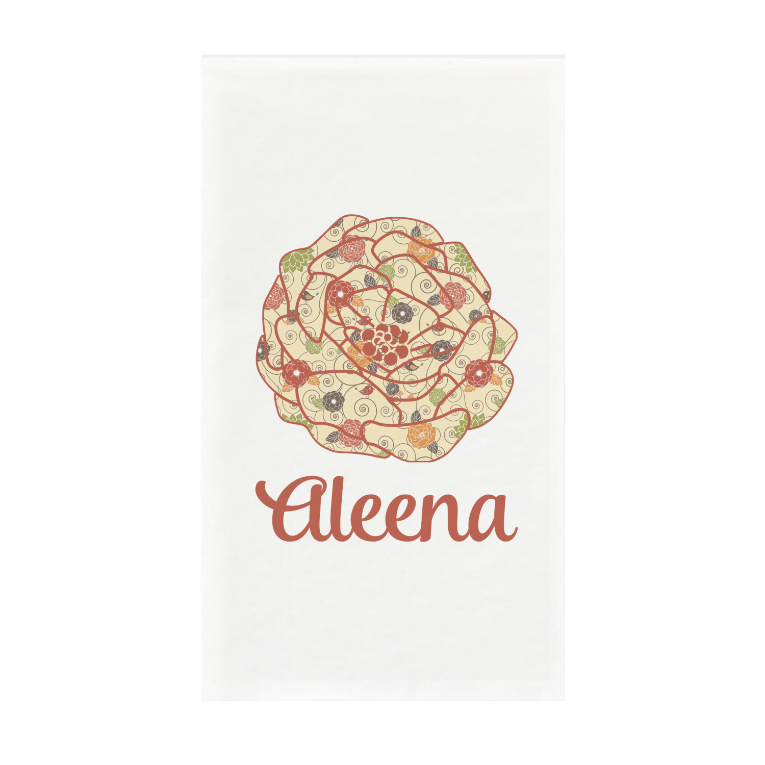 The design has a classic ribbon with a decorative circle frame in a beautiful fall color of orange brown. The personalization is an interlocking monogram, but can just as easily be a name, an initial or any text that you would like.