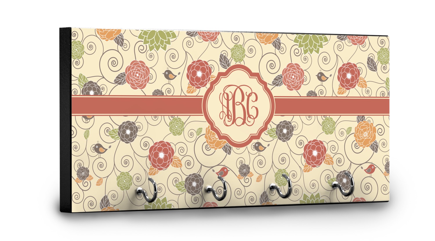 This 11" x 5" key hanger is made of sturdy wood and has four metal hooks lining the bottom. This is the perfect size for a family with several drivers. Not only can you hang keys on it though, but pet leashes and other small items. The board is black on the sides and back and is printed with the design of your choice on the front.