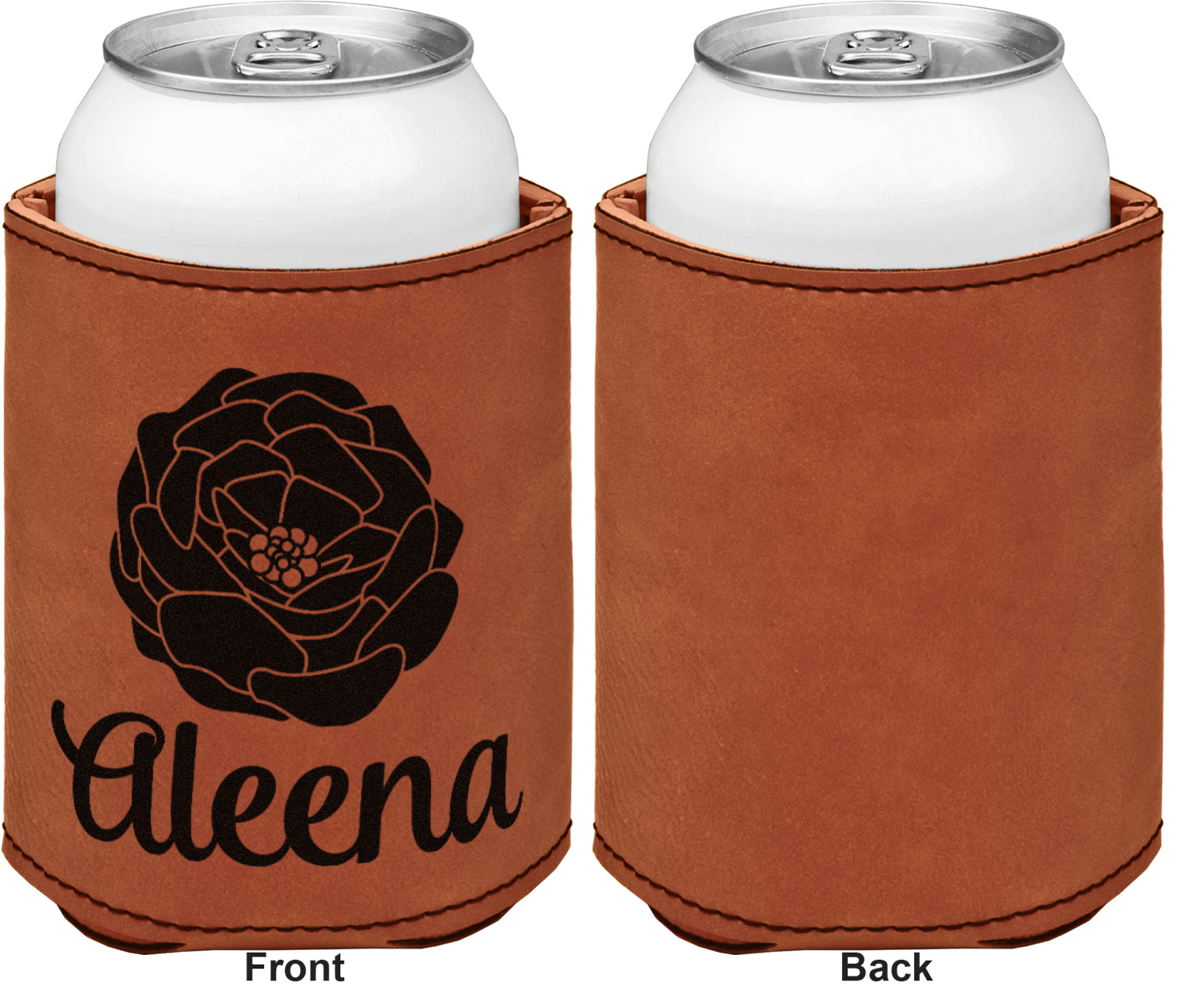 This can sleeve is made from a cognac-brown leatherette and stitched with a sturdy, black thread. A slim padding lines the inside of your can sleeve to allow for a better fit once your drink is inserted. The sleeve itself measures at 4 by 4.5 inches, allowing this custom can sleeve to accommodate most canned drinks. Your personalized design can be engraved on the front and back, or solely the front. When laser-engraved, your design appears as a black coloration which contrasts the leatherette nicely.