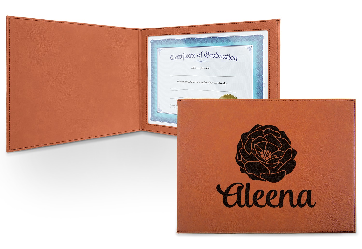 This cognac-colored, leatherette certificate jacket is the ideal way to display or store your hard-earned certificate. When closed, the custom certificate holder measures at 12 by 9 inches. The interior of the certificate cover includes a clear, vinyl window to encase your diploma. The window measures at around 10.5 by 7.5 inches and can accommodate a diploma that measures at up to 8.5 by 11 inches. You can either choose to have your customization laser engraved on the front and interior, or solely the front.