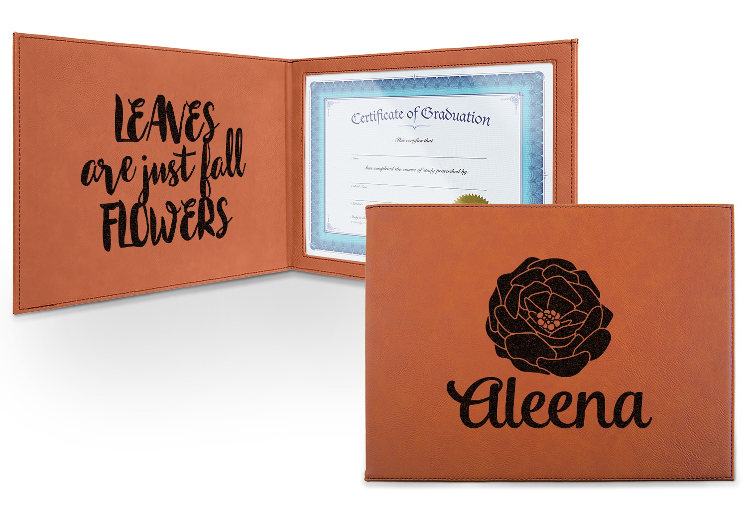 This cognac-colored, leatherette certificate jacket is the ideal way to display or store your hard-earned certificate. When closed, the custom certificate holder measures at 12 by 9 inches. The interior of the certificate cover includes a clear, vinyl window to encase your diploma. The window measures at around 10.5 by 7.5 inches and can accommodate a diploma that measures at up to 8.5 by 11 inches. You can either choose to have your customization laser engraved on the front and interior, or solely the front.