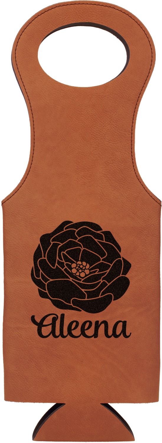 This wine carrier is made from a stunning leatherette, in a cognac-brown color. Strong, black stitching lines the sides of your wine bottle bag and provides extra durability. The interior is lined with a padded, black material to allow for a snug fit once your bottle is placed inside. At the top of this wine gift bag, you'll find two oval shaped handles that elegantly complements the rest of the bag's style. We provide you with the option of laser-engraving the front, or the front and back of your new personalized wine bag!
