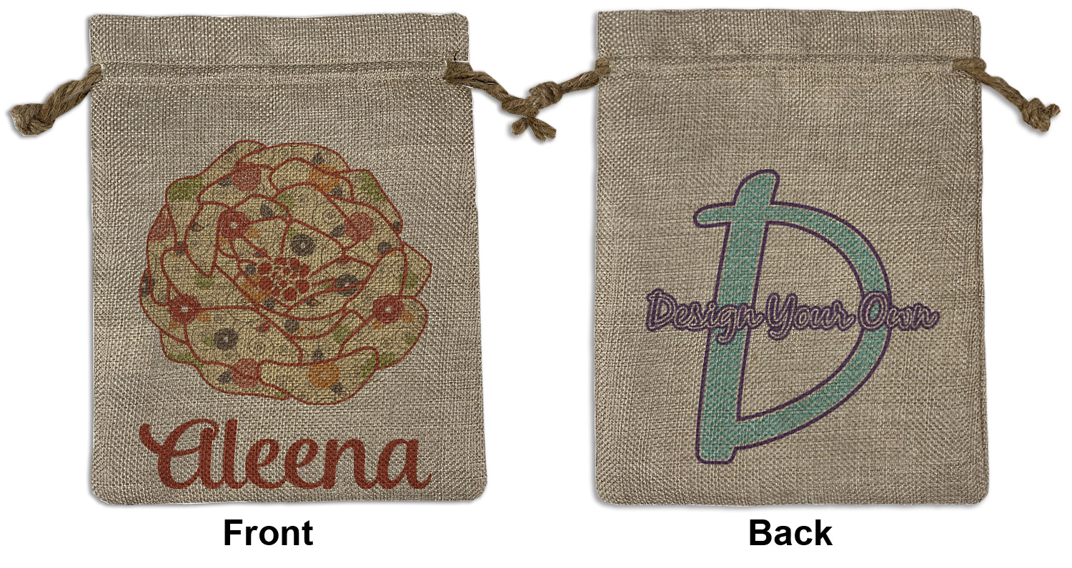 We sell our Burlap Gift Bags in 3 variant sized bags. Made with burlap polyester, each personalized bag can be secured with a twine drawstring pull. Your custom design is available to print on one side or both sides - completely up to you! The sizes of the bags measure approximately 4.5" x 6.5" for the smallest size, 6.5" x 8.0" for the medium size, and 6.5" x 13.5" for the large-sized bag.