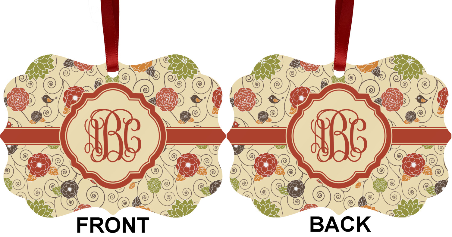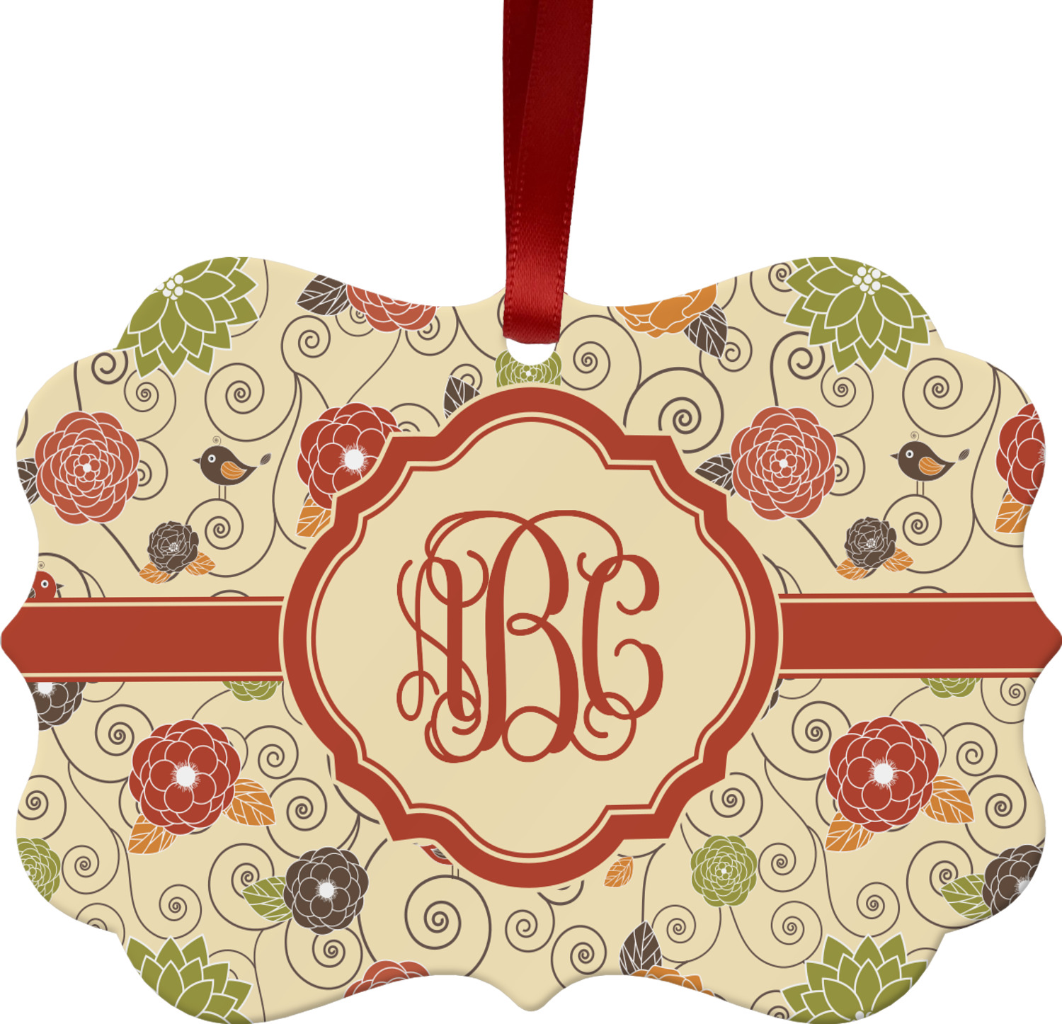 The design has a classic ribbon with a decorative circle frame in a beautiful fall color of orange brown. The personalization is an interlocking monogram, but can just as easily be a name, an initial or any text that you would like.