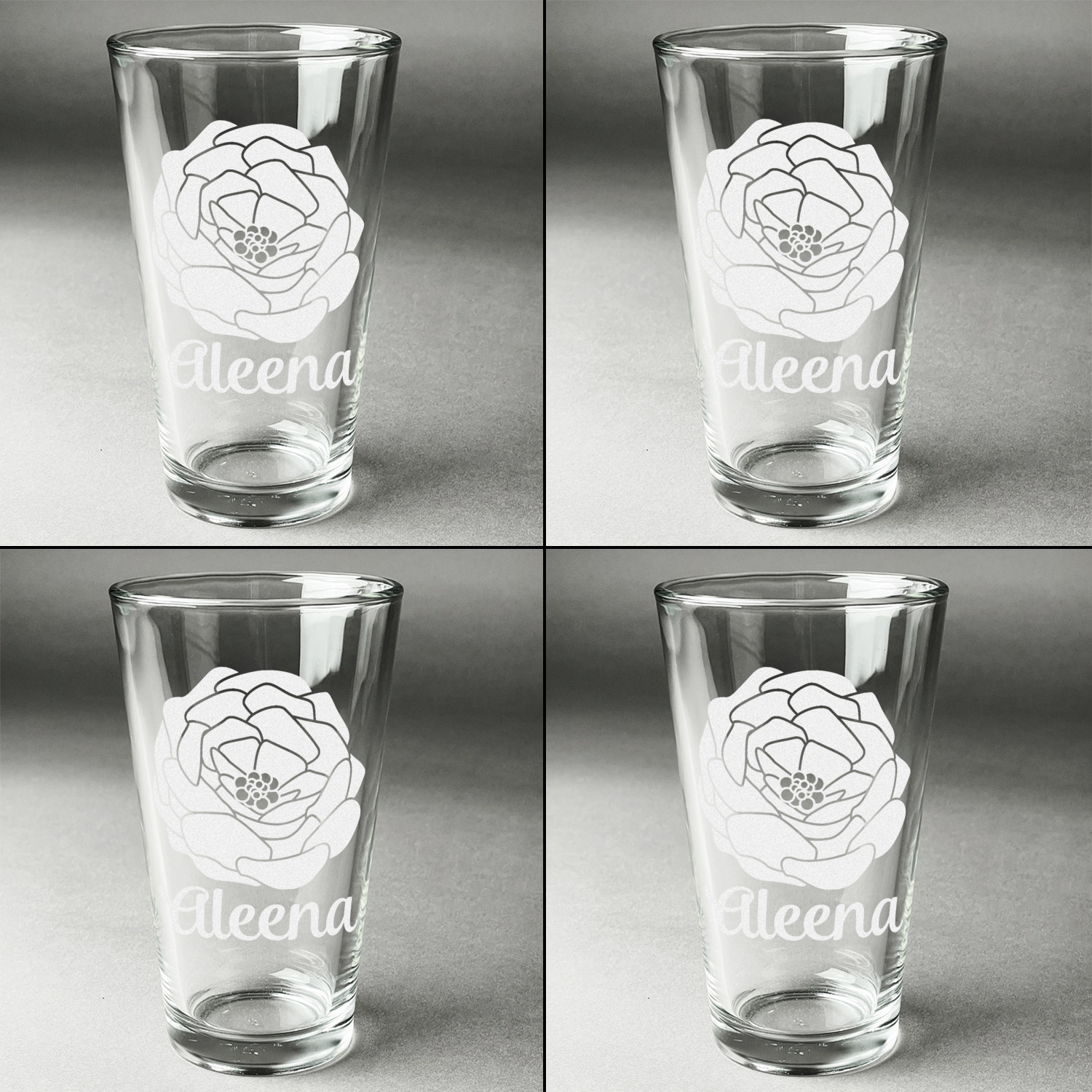 Available in a single glass or a set of 4 - each glass will be custom engraved with your design. Each glass holds 16 oz and measure 5.75"H x 3.5"W.