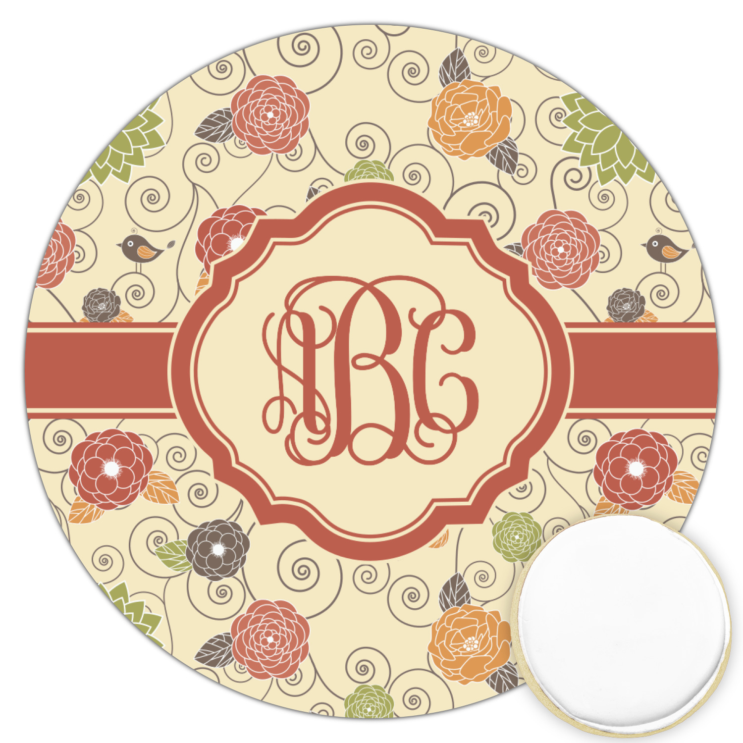 The design has a classic ribbon with a decorative circle frame in a beautiful fall color of orange brown. The personalization is an interlocking monogram, but can just as easily be a name, an initial or any text that you would like.