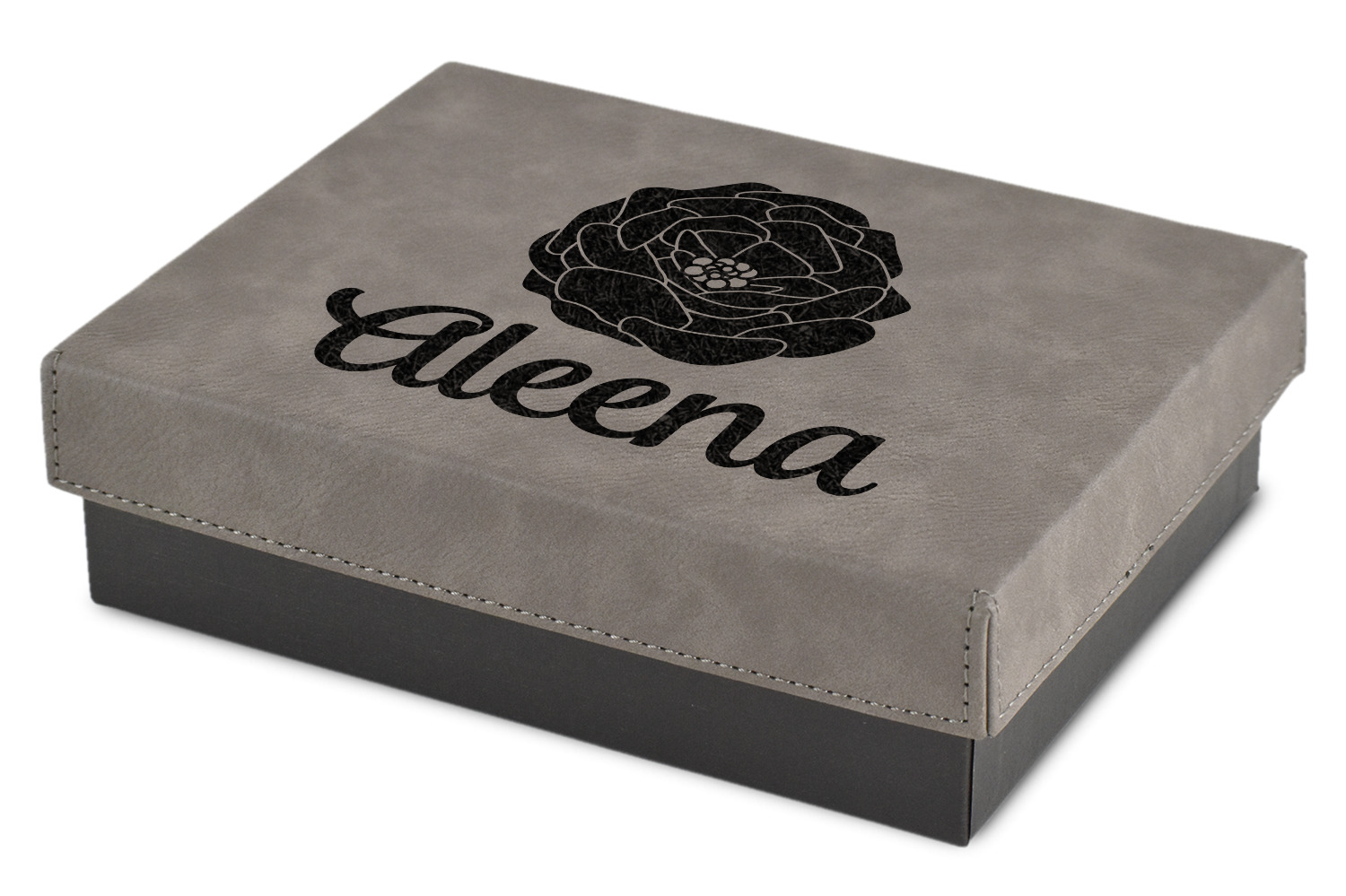 These gift boxes are available in 3 different sizes to accommodate various sized gifts. Available in gray as a neutral color for any occasion as well as to showcase your design boldly. Engraved with a laser this high quality paper board and faux leather gift box is unique and makes any gift stand out.