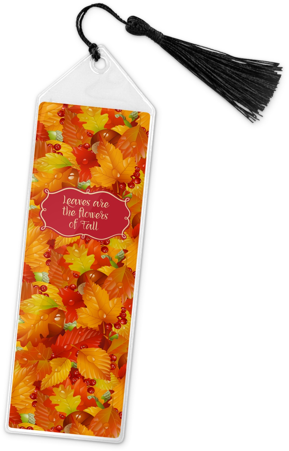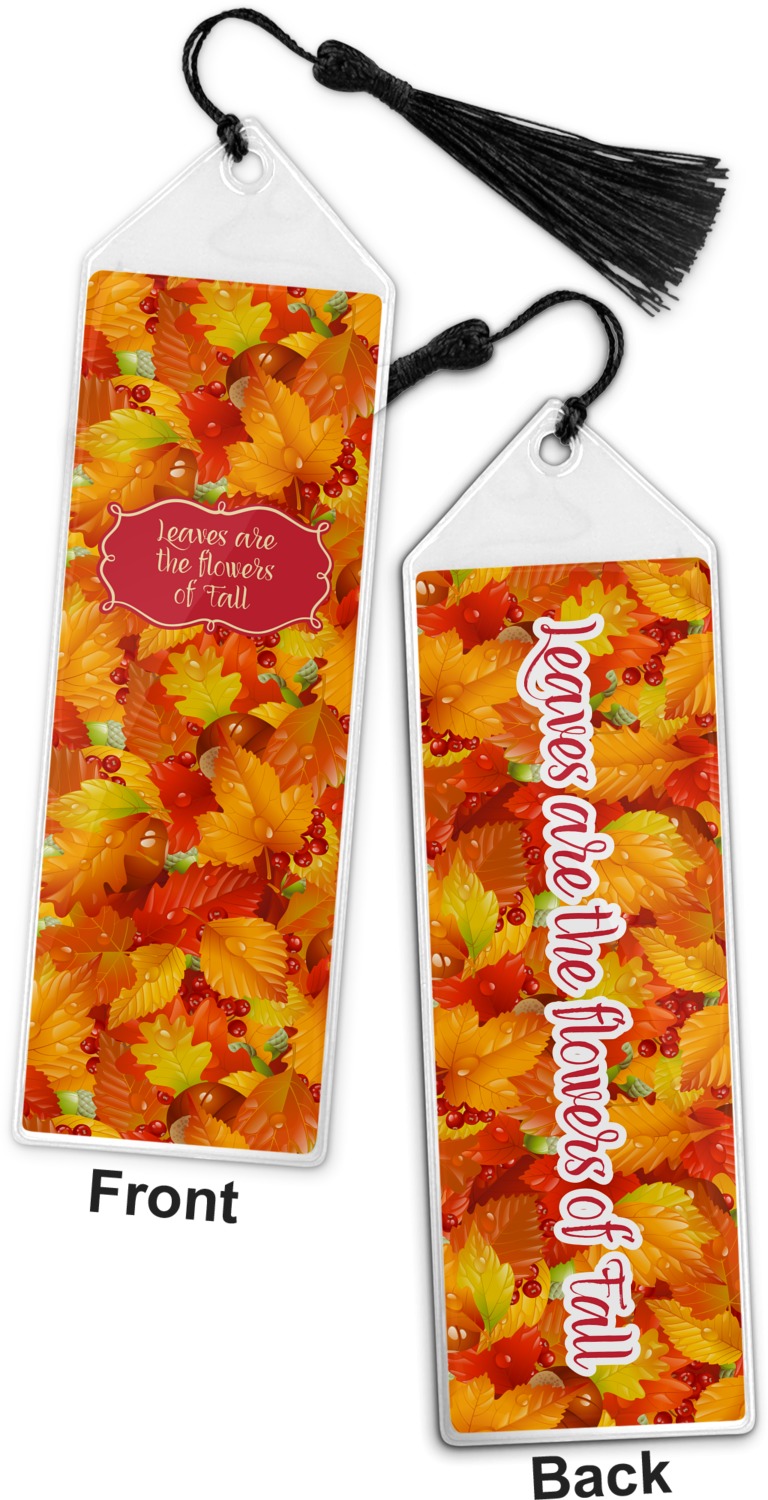 Your personalized bookmark is made of a sturdy, clear vinyl, and is approximately 7.5" x 2.25". We display your personalization on vinyl inserts that are placed on both sides. Accompanying each book marker is a black, fringe tassel that attaches to the reinforced, triangular header.