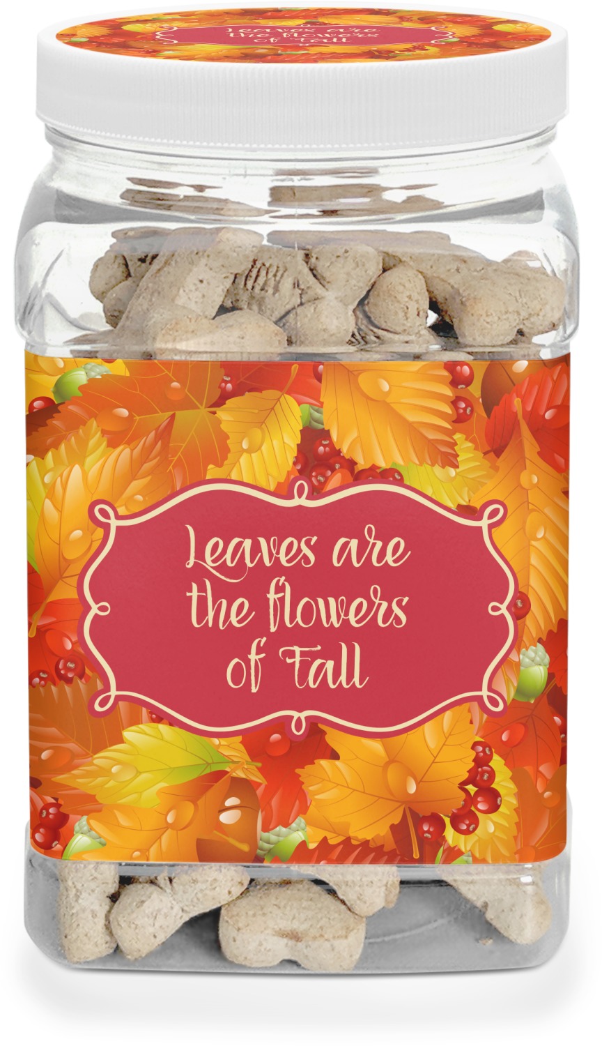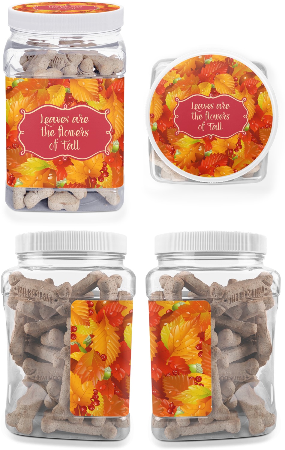 This half gallon jar, made from a sturdy plastic, is the perfect way to keep treats from any naughty pet paws, while still keeping them ready on hand for when your pup performs an impressive trick. This dog cookie jar features a screw-on, white lid that displays your personalized design on a vinyl sticker. We apply another customized sticker that wraps around the front and sides of the jar. Our dog treat jar also has indentations on the rear ends of the sides, which allows for convenient handling, and its square frame allows for easy storage.