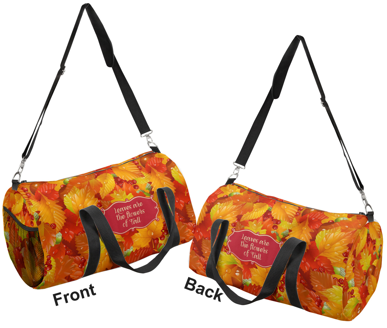 This duffle is a sturdy bag made of a canvas material. It comes in two sizes: Small (19"W x 9.5"H x 9.5"D) and Large (23"W x 12"H x 12"D). The bag is a cylindrical shape with a black adjustable strap and two handles. On one side is an elastic pouch to put a waterbottle or other small item. Your product will be sublimated with your design and is able to be designed on the front, back, and sides. Be sure to remember that the straps may cut into parts of your design if you upload your own artwork.