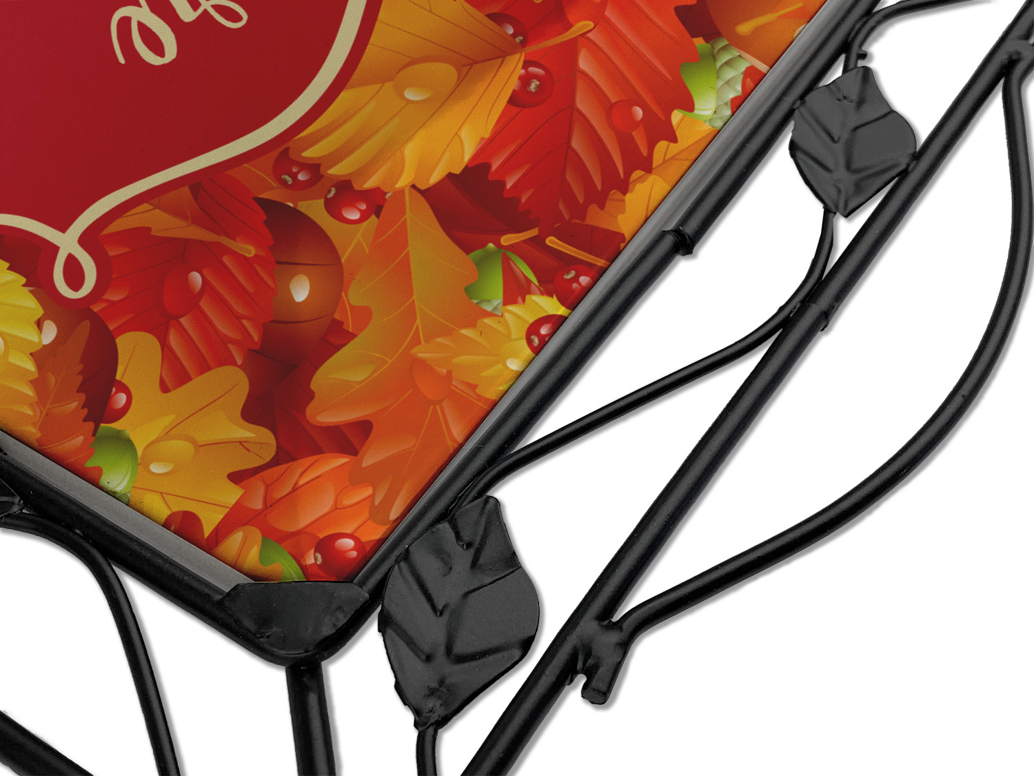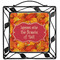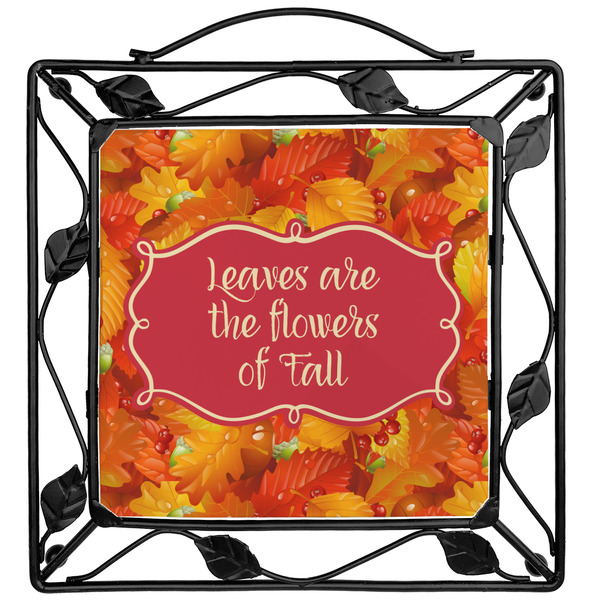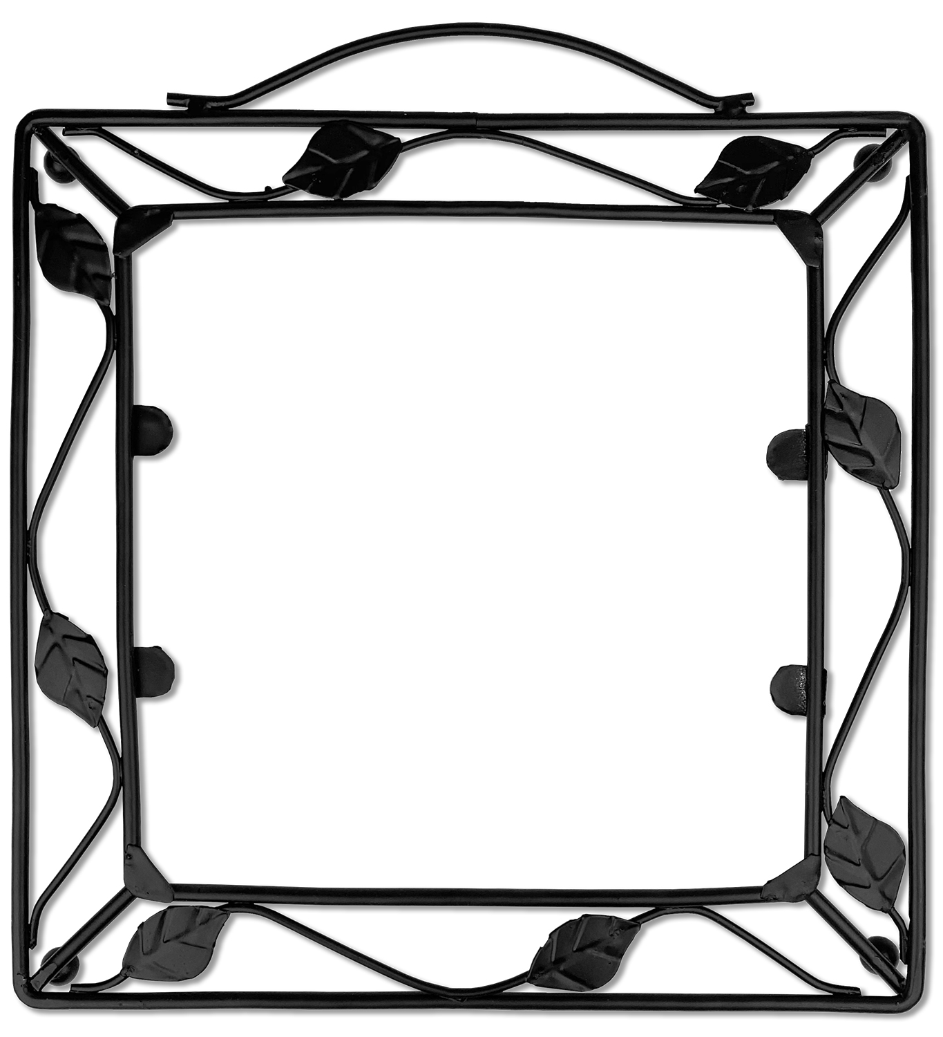 Our square trivets are made from a durable, wrought iron. This model features 4 small half circles, one on each corner, and a larger ring of iron that circles the central, customized tile. Each of the 4 corners has a round foot on its bottom for stability. This trivet is 8.75 by 8.75 inches, but the central tile measures at 6 inches on both sides.