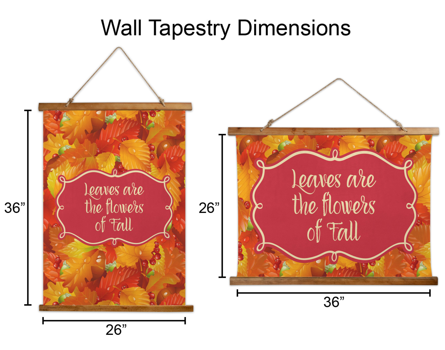 Made in two different orientations - portrait or landscape - both are 26" x 36". Your design is printed on a high quality polyester fabric with hemmed edges. The wood on the top and bottom of the tapestry is 1.25" tall and 0.25" thick and there are two pieces on top and bottom which sandwich the fabric.