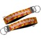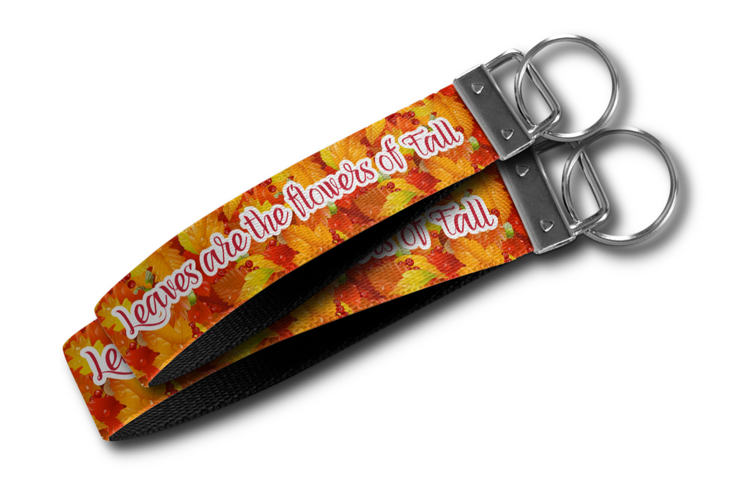 These key fob keychains are made from a polyester weave, right here in the USA. They feature a silver, metal clasp, attached to a round keyring. The piece gives the personalized wristlet a beautiful, finished look. Your customized design is printed on the outside of the keychain strap. We carry these wristlets in two sizes: small, which is 5 inches in width, and large, which is 5.5 inches in width.