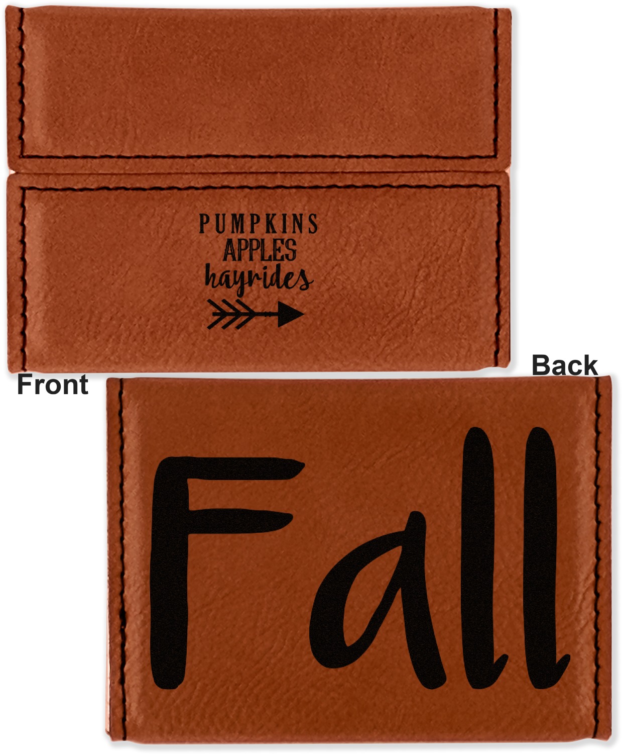 Your personalized design is laser engraved onto either the front, or the front and back of the card holder, depending on the model you purchase. Once engraved, the design will appear a darkened black against the cognac color of the leatherette.
