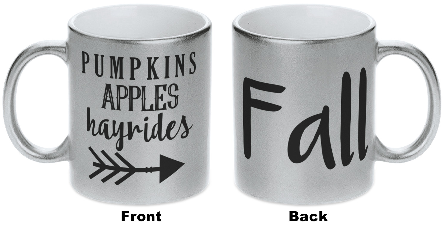 Our custom mugs are ceramic, which is great for keeping your tea or coffee warm! We offer two metallic mugs to personalize - Silver or Gold. Both styles hold around 11oz and have dimensions of approximately 3.75" x 3.5" x 4.75". Both the metallic mugs come in a matte finish and have glitter detailing to add a more pristine feel to the gold and silver base colors.