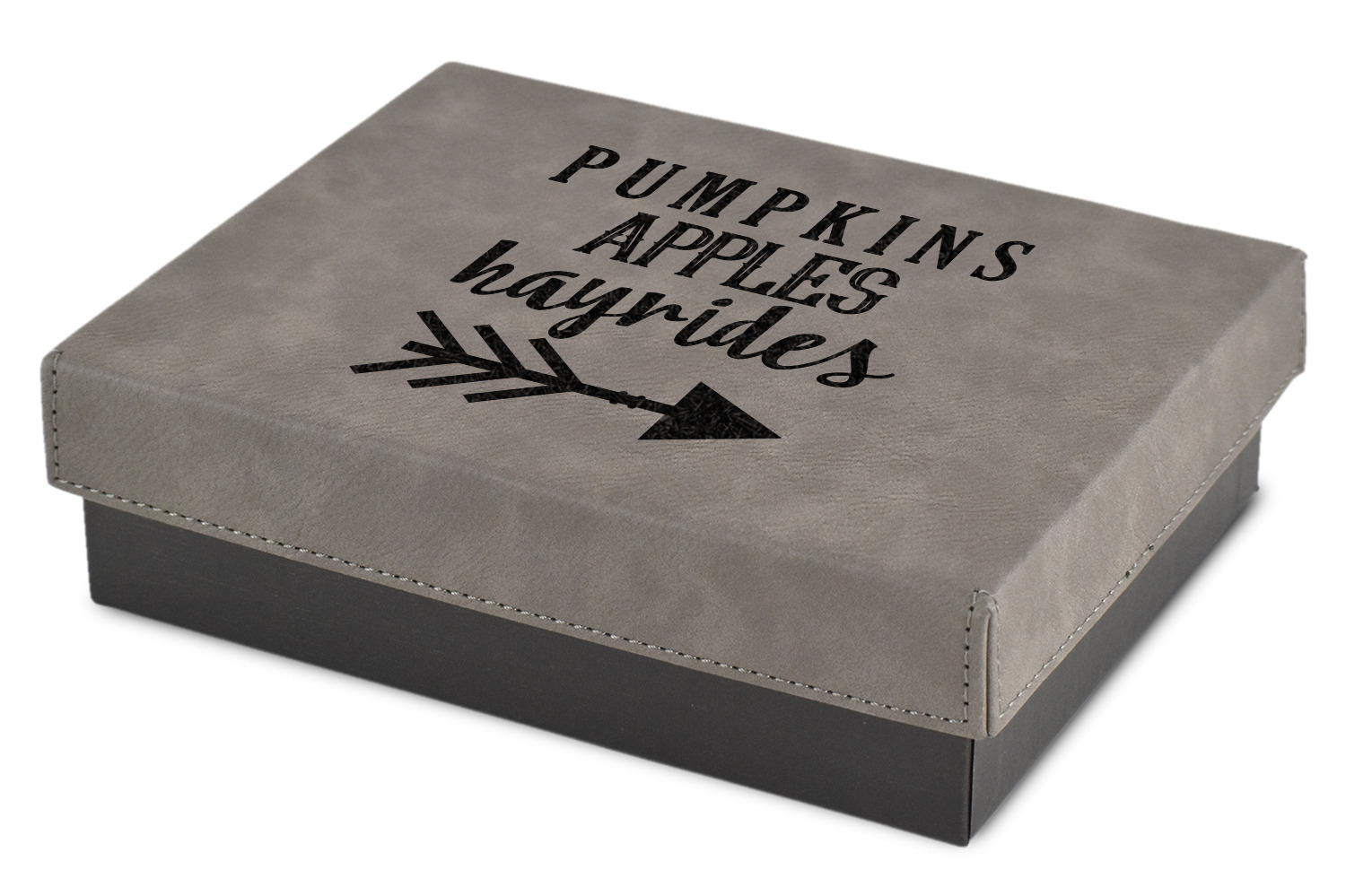 These gift boxes are available in 3 different sizes to accommodate various sized gifts. Available in gray as a neutral color for any occasion as well as to showcase your design boldly. Engraved with a laser this high quality paper board and faux leather gift box is unique and makes any gift stand out.