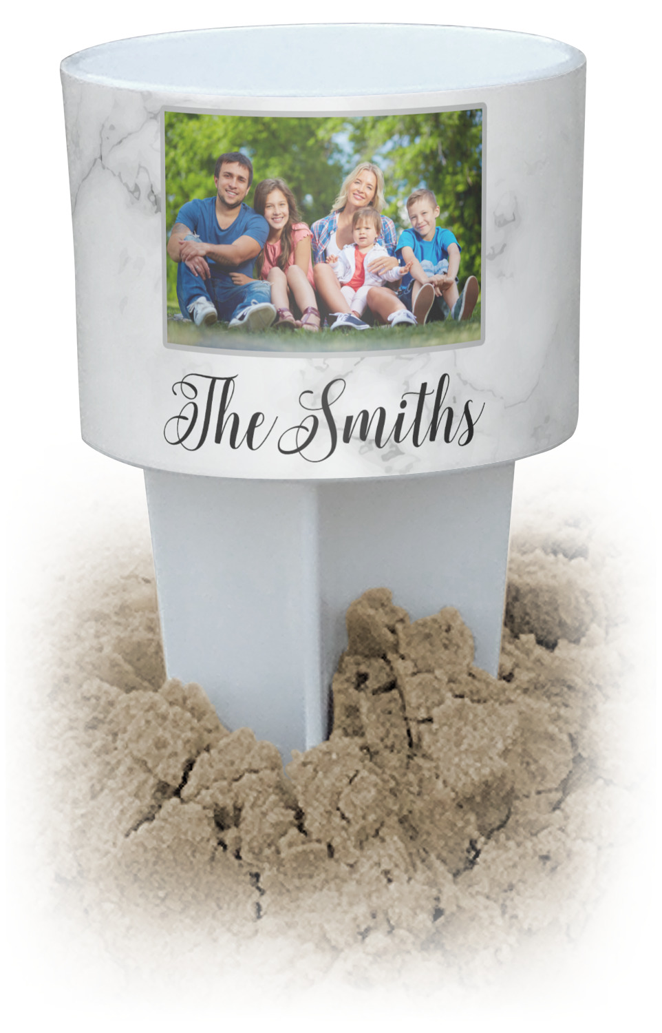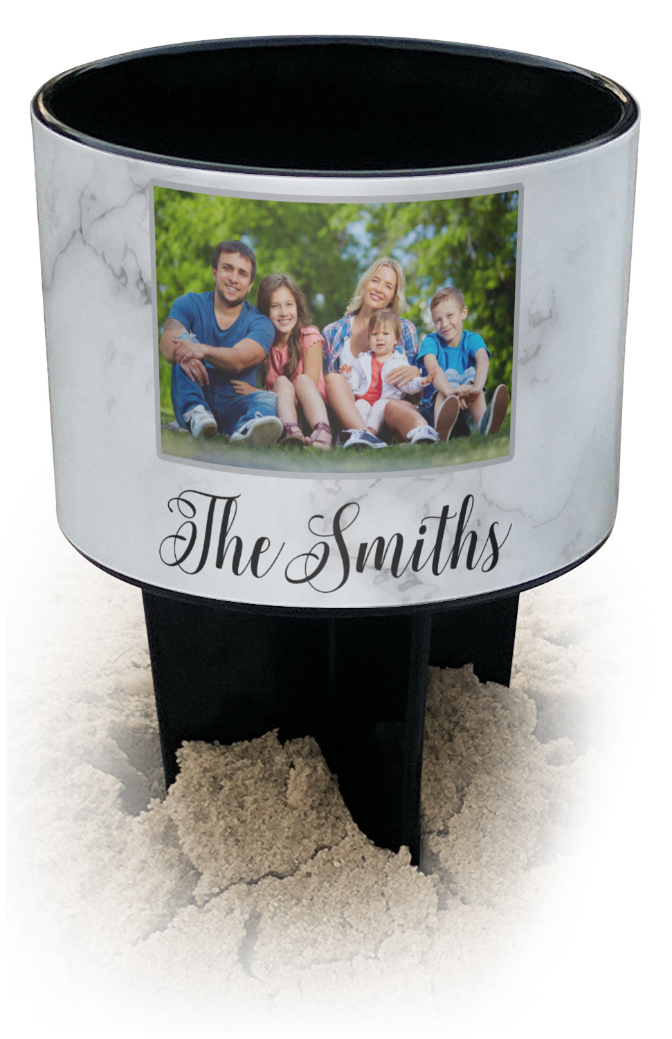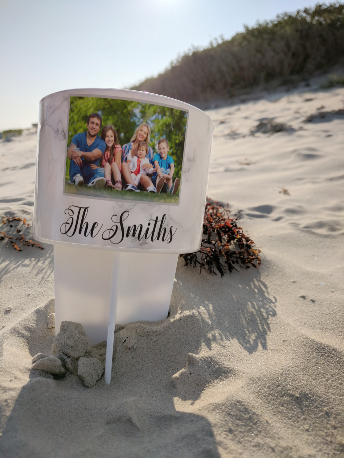 This cup holder has a large stake at its bottom that anchors it to the sand or ground below, while the cup holder rests above the stake. The entire drink holder is made of durable plastic and displays your customization around the cup holder portion. We sell these personalized beach spikers in two different colors: black and white.