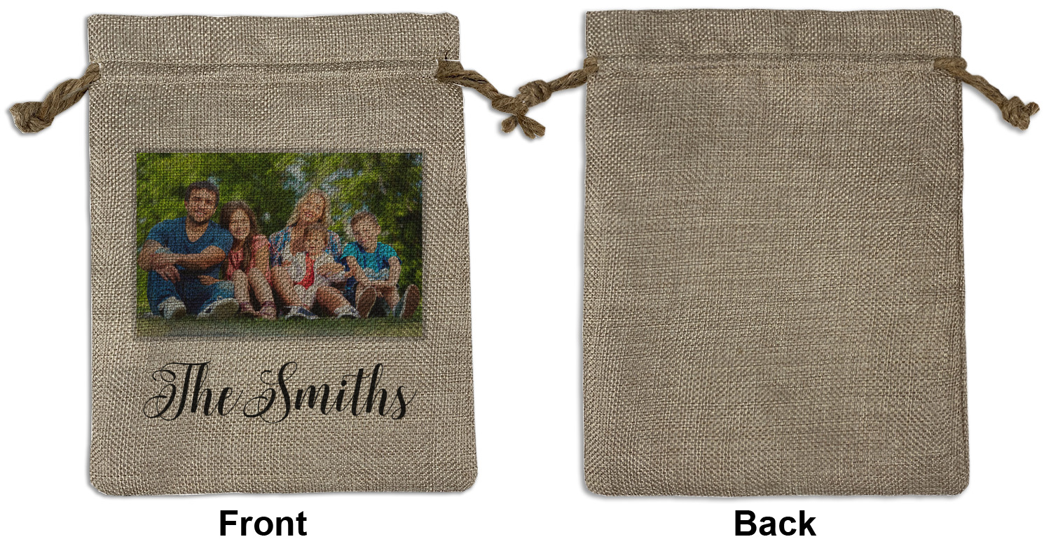 We sell our Burlap Gift Bags in 3 variant sized bags. Made with burlap polyester, each personalized bag can be secured with a twine drawstring pull. Your custom design is available to print on one side or both sides - completely up to you! The sizes of the bags measure approximately 4.5" x 6.5" for the smallest size, 6.5" x 8.0" for the medium size, and 6.5" x 13.5" for the large-sized bag.