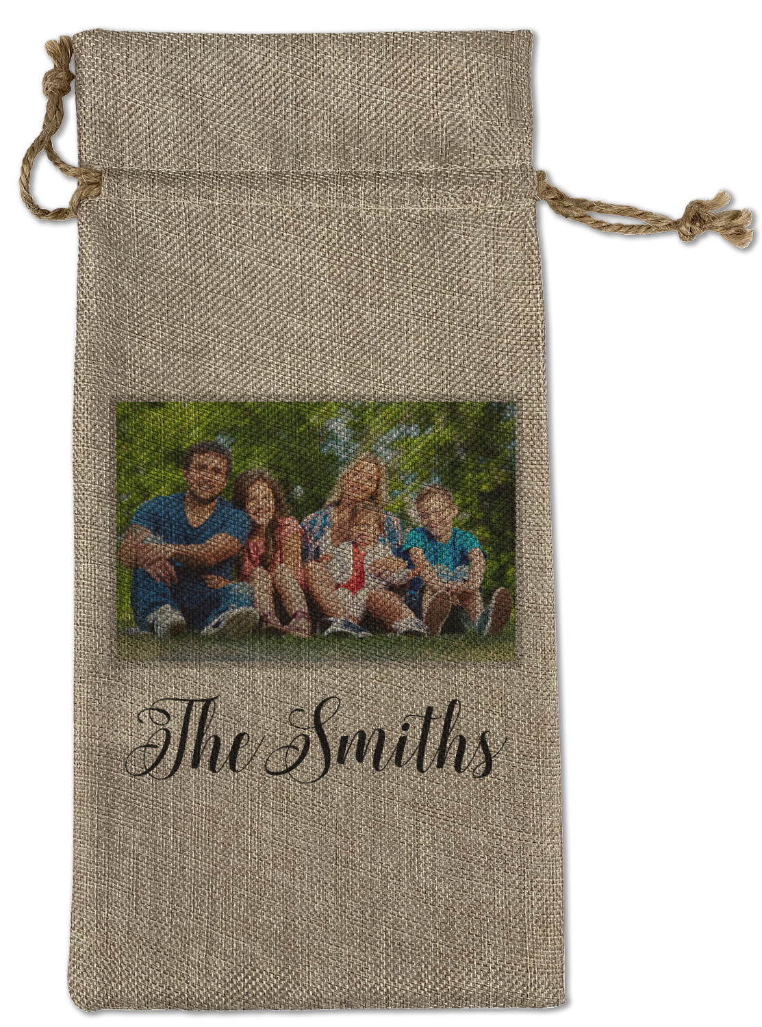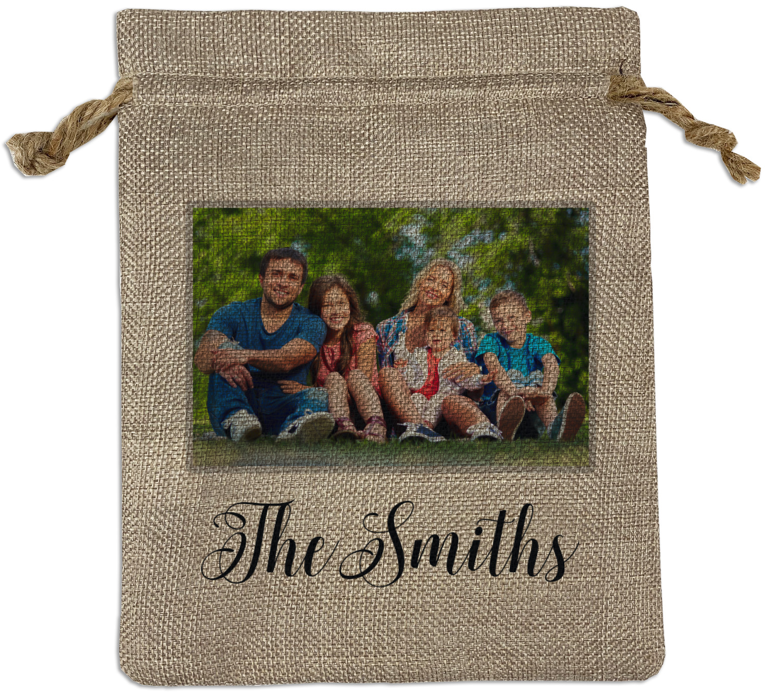 We sell our Burlap Gift Bags in 3 variant sized bags. Made with burlap polyester, each personalized bag can be secured with a twine drawstring pull. Your custom design is available to print on one side or both sides - completely up to you! The sizes of the bags measure approximately 4.5" x 6.5" for the smallest size, 6.5" x 8.0" for the medium size, and 6.5" x 13.5" for the large-sized bag.