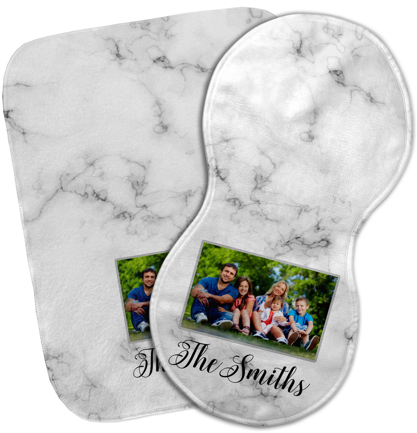 Choose your baby burp cloth from our two styles - Fleece (rectangular) or Microfiber Velour (peanut shape). The lightweight and absorbent design makes each burp cloth multipurpose; use them as a burp pad, a lap pad, a changing table, or a spare cloth to clean up any baby mess. Your customization is displayed across the front with baby-safe ink to ensure extra comfort with a white backing.