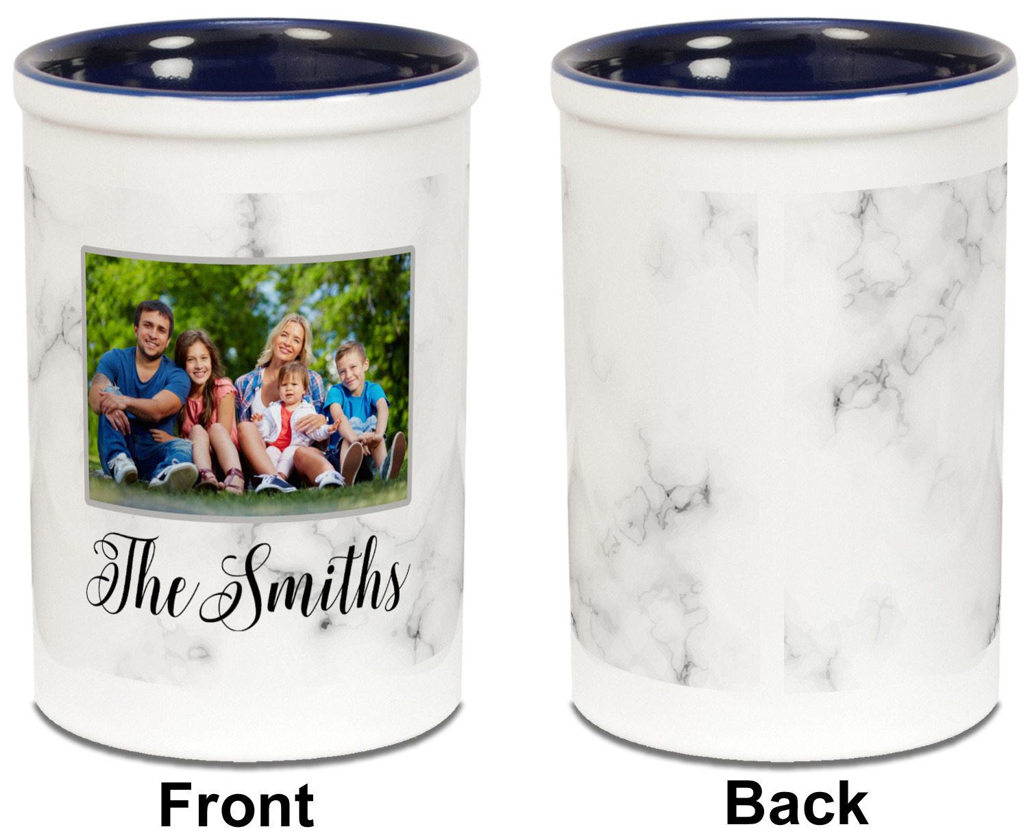 Both the blue and black pencil holders are a ceramic material, giving you a sturdy and long-lasting pen and pencil holder. We print your designs on the exterior of the pencil cup, covering most of the outside surface. There is a small white border on the top and bottom of the exterior of the pen holder, setting apart your design from the interior's color. Our ceramic pen caddy is roughly 3.5" x 3.5" x 5" in dimensions.