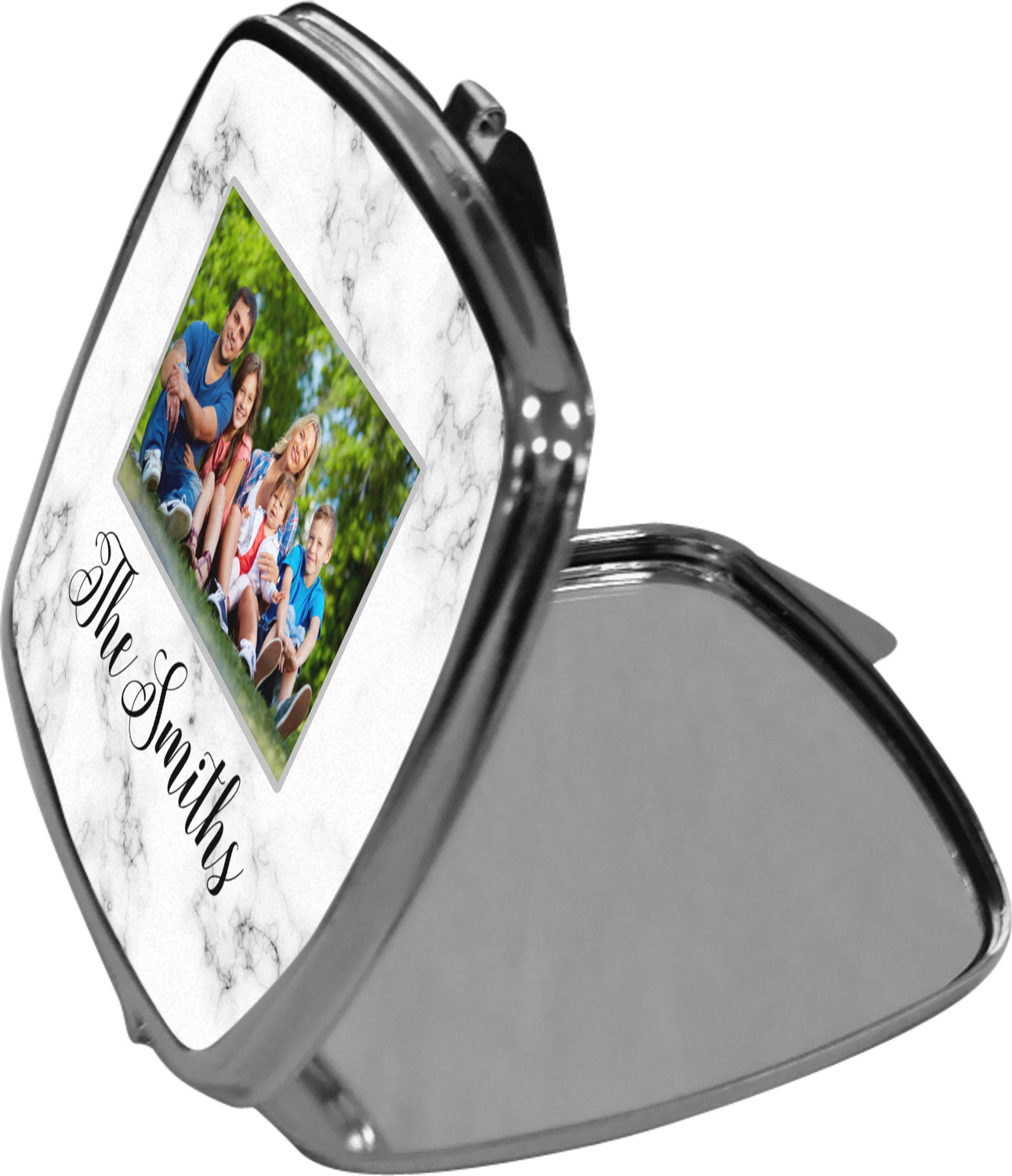 Our compact mirrors are customized with your design on one side. The other side is patterned silver tone metal. Inside, there are two mirrors.
