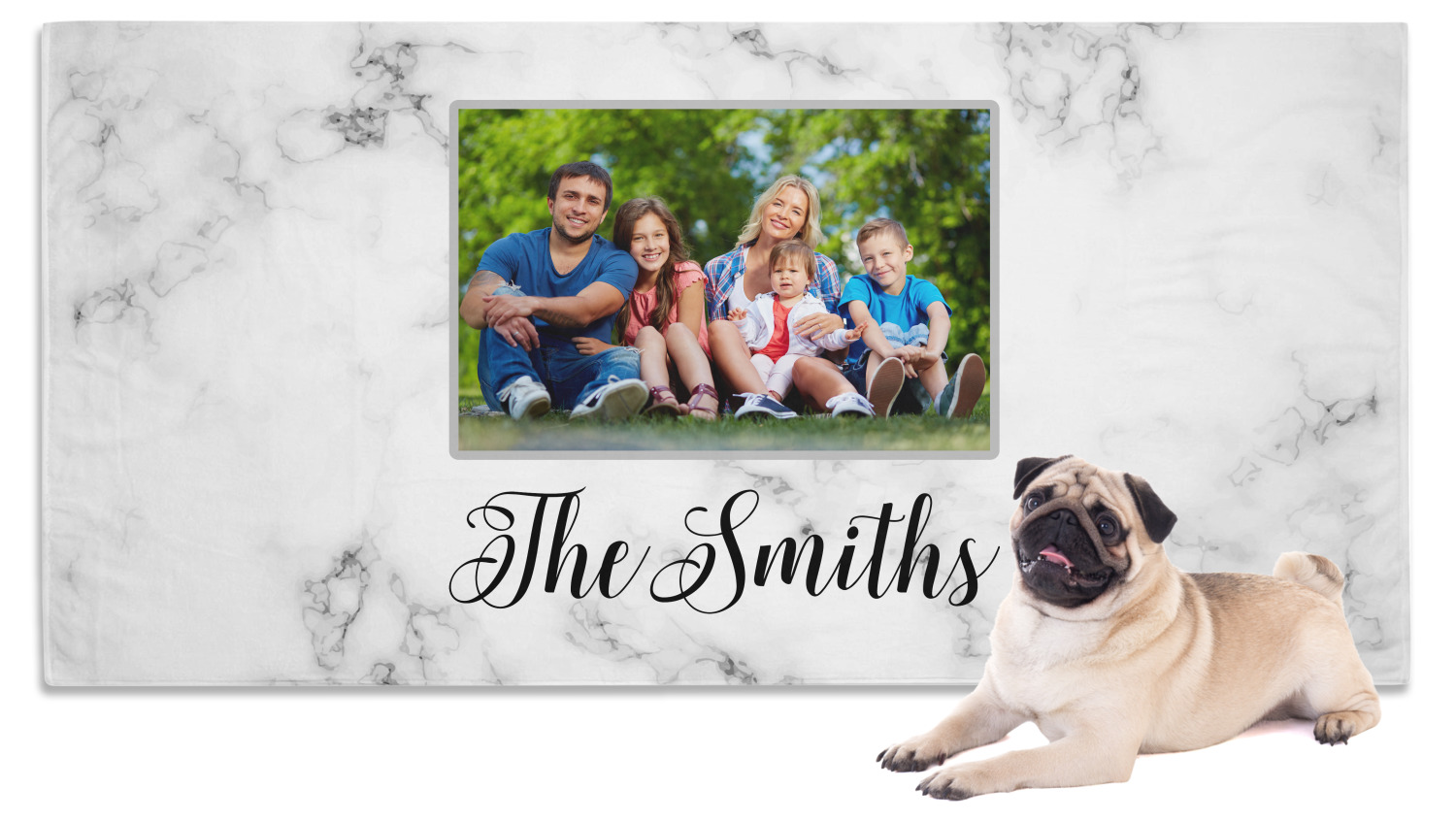 Our custom towels are crafted from a special blend of polyester and polyamide, which contributes to its lightweight, yet thoroughly absorbent nature. We craft it as such to guarantee efficiency as a convenient product; its lightweight nature makes it easy to roll up and carry along, yet it is still able to dry off even the wettest, muddiest pet. It measures at 60" x 30" and is sizable enough to dry off even the largest of pets. With our towel's gentle, soft-to-the-touch material, your pet will be sure to anticipate its warm, dry embrace. We print your personalized design on the front of the towel, while the back is white.