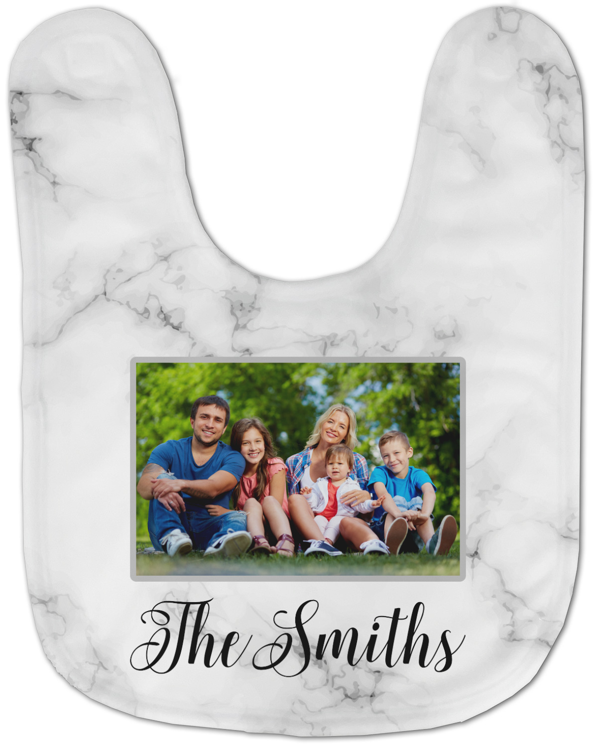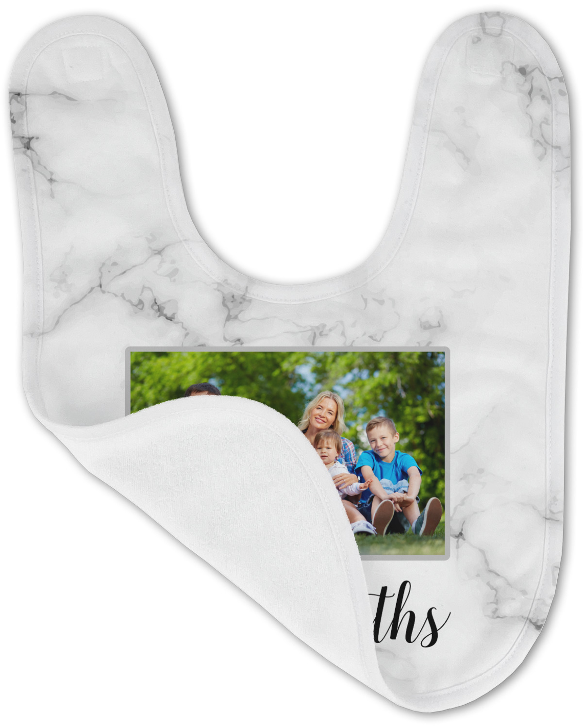 Made of soft polyester, each customizable bib hugs comfortably around the neck to catch every drip and drool. Each bib design is printed with baby-safe ink and finished with a secure stitch pattern and velcro clasp. We carry two customizable bib styles -Microfiber Velour and Jersey Knit.