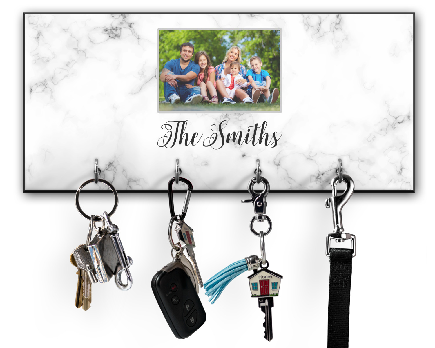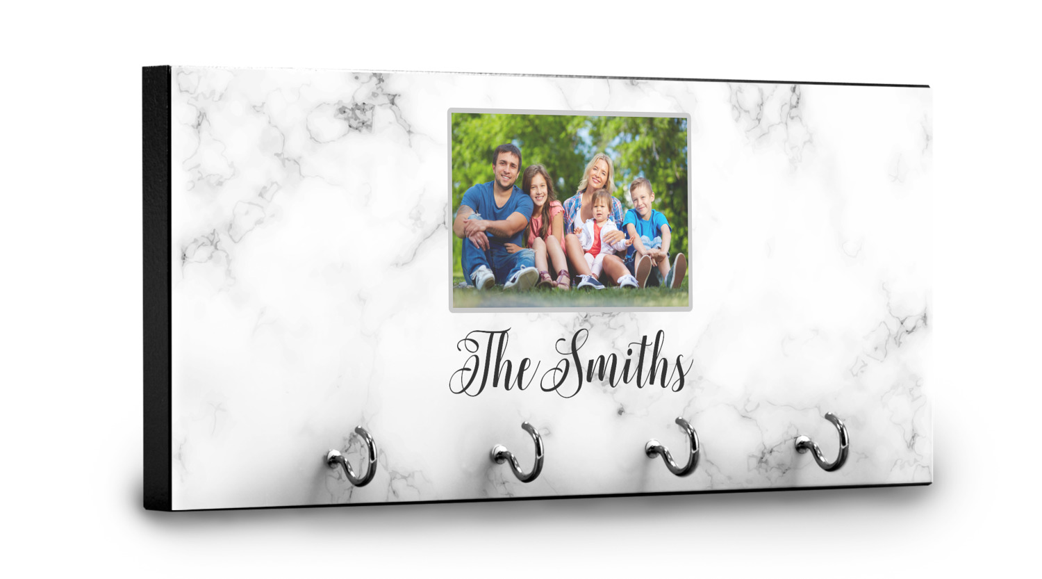 This 11" x 5" key hanger is made of sturdy wood and has four metal hooks lining the bottom. This is the perfect size for a family with several drivers. Not only can you hang keys on it though, but pet leashes and other small items. The board is black on the sides and back and is printed with the design of your choice on the front.