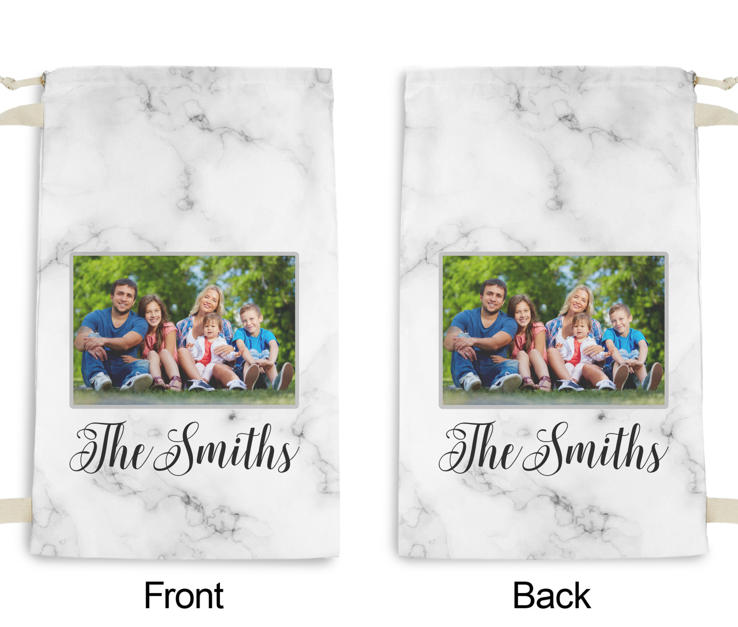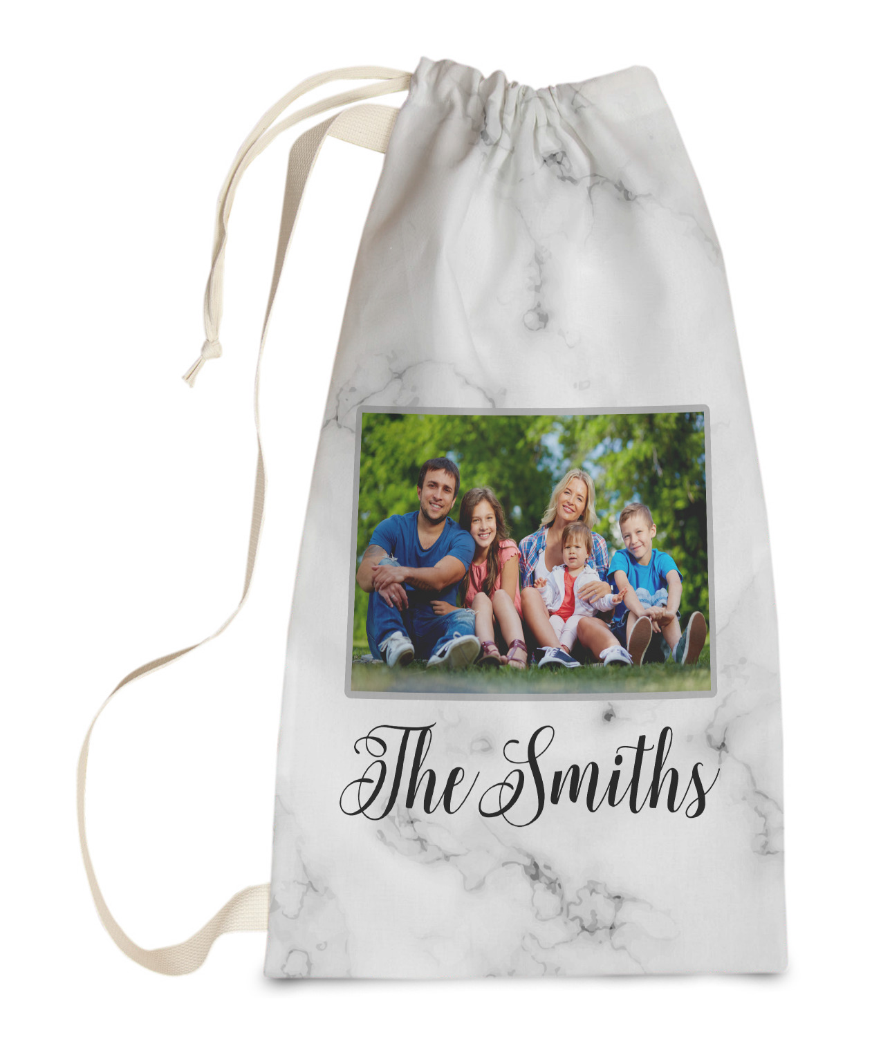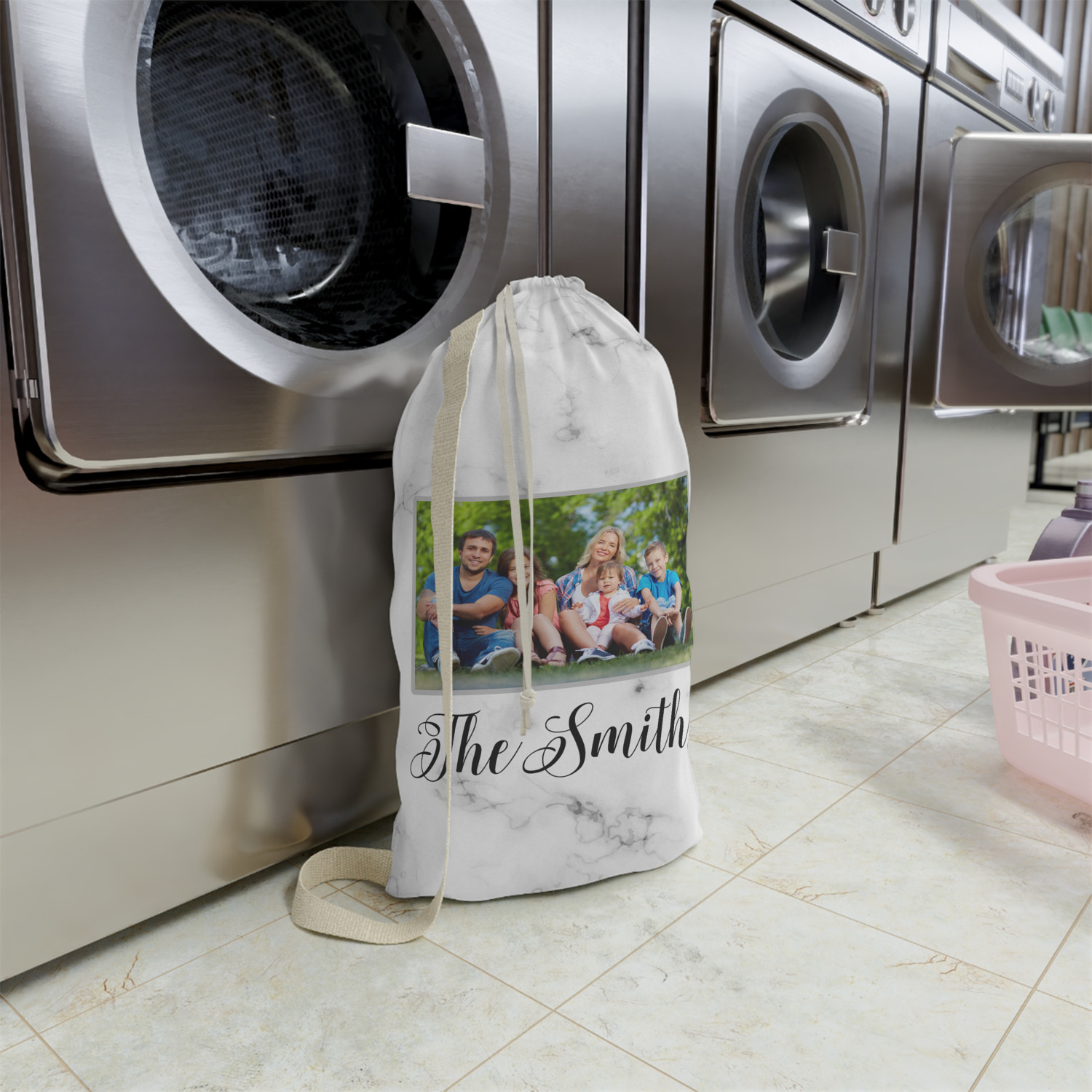 Carry your laundry in style with these customized laundry bags. Available in two sizes, featuring a natural colored woven strap and a cinch cord, these bags hold a lot of clothes or anything else you want to fit in them.