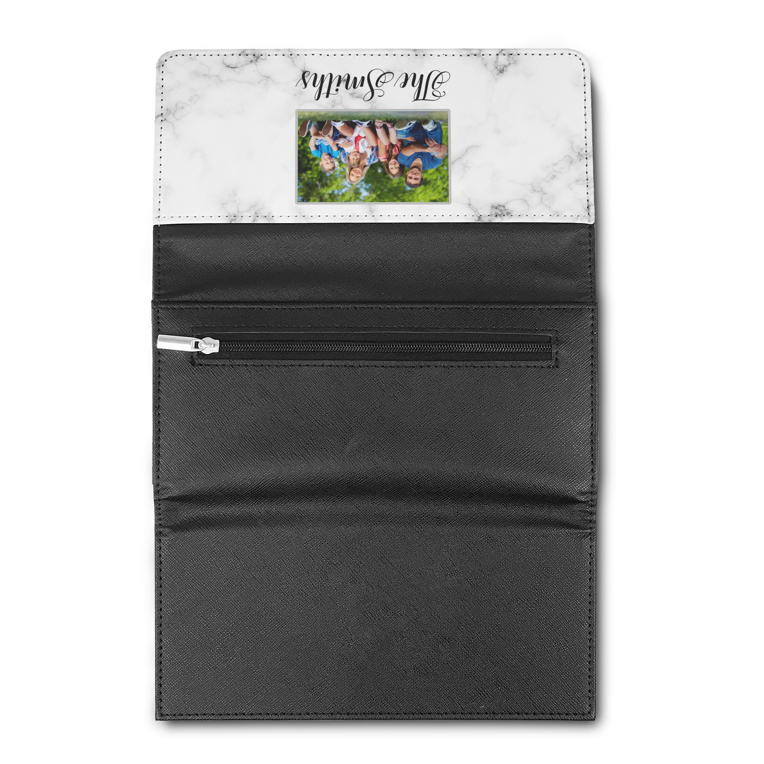 These beautiful wallets are a trifold design. The wallet is made of textured leatherette. The front section has a secure magnetic snap. The front flap is personalized with the artwork of your choice to make this wallet uniquely yours.