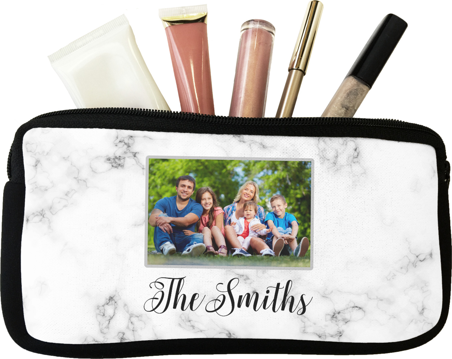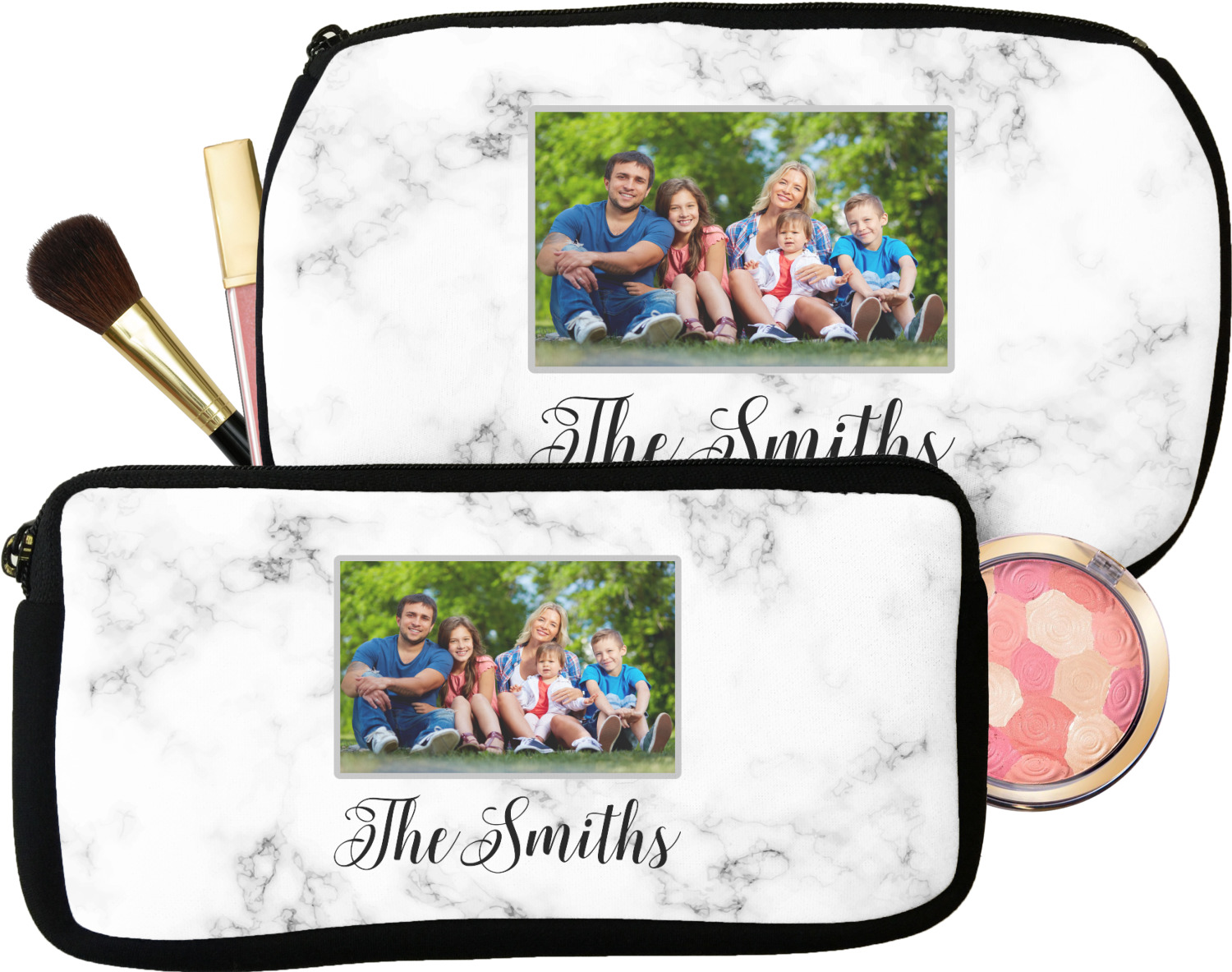 Our personalized makeup bags are available in many different designs, patterns and colors - so you are sure to find one that will love. They are made of neoprene (same material as wet-suits) and thus are water resistant, so spillages in your makeup bag will not end up all over you purse. They are customized on one side and are black on the other side and the zipper is black as well.