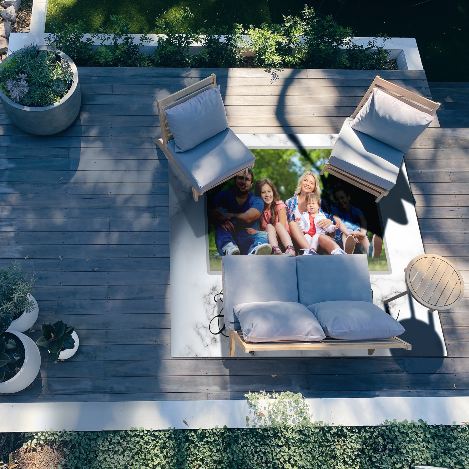 Our custom patio area rugs are velvety soft and smooth, with a short pile, beautiful sewn corners and edges for a refined and exquisite finished look. The poly chenille face is printed with your design and is sure to brighten up any room with its fabulous look. They have just enough cushion to feel comfortable under foot but not soak up water in the weather and offer a quick drying material.