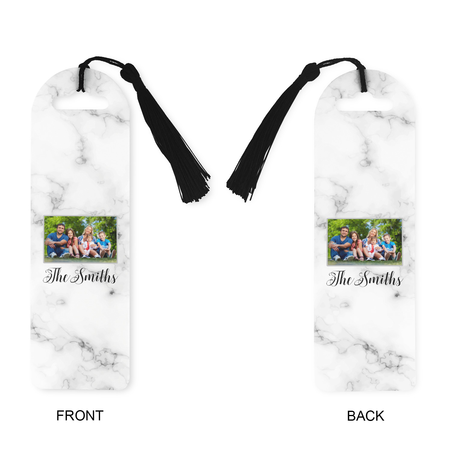 Made from a durable, flexible plastic, these bookmarks are printed with your custom design on them. With the tassel on them they make it easy to find your page in your book. These are a rectangular shape 7 1/4 inches tall with a rounded top and are approximately 2 1/4 inches wide.