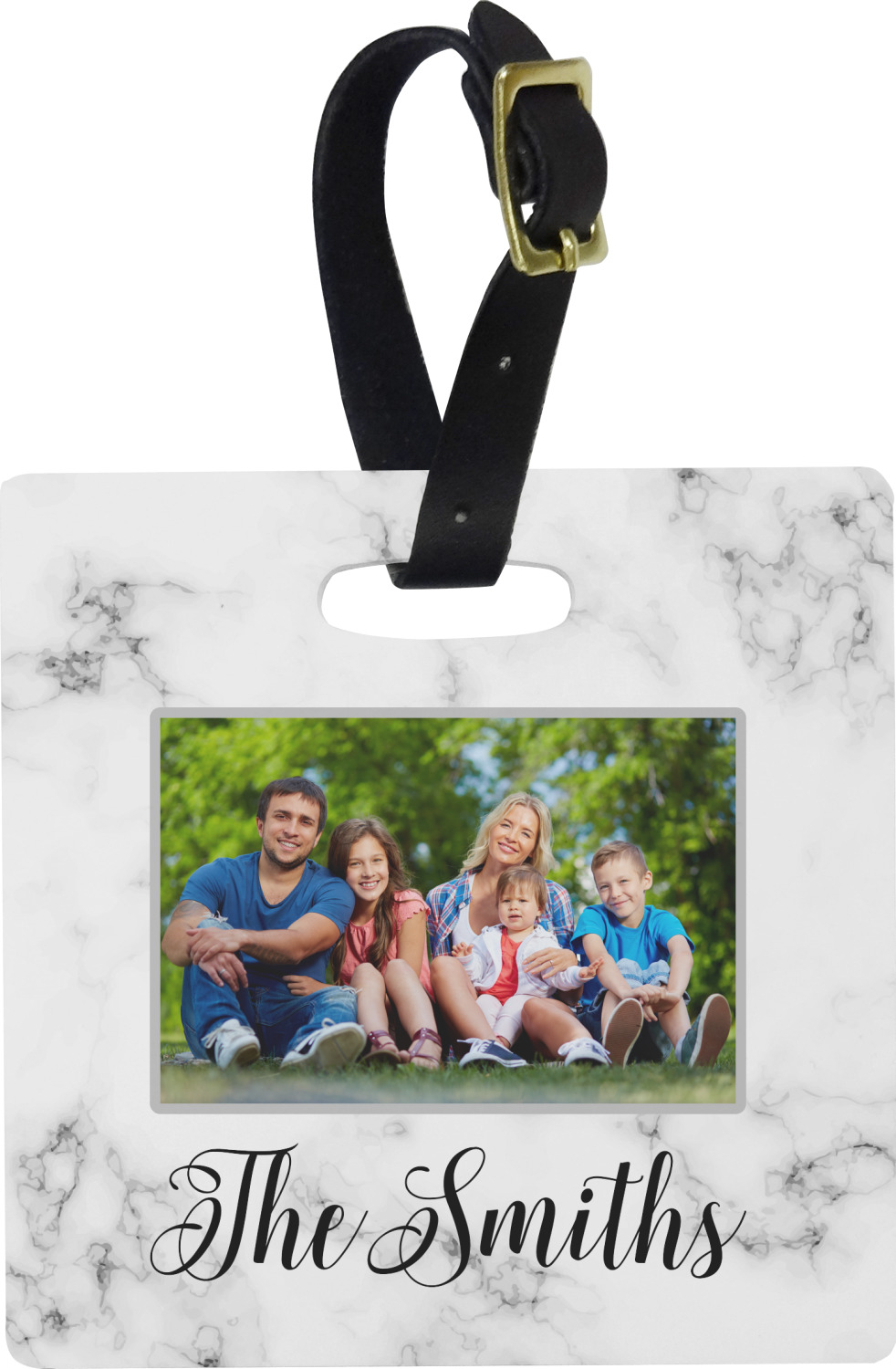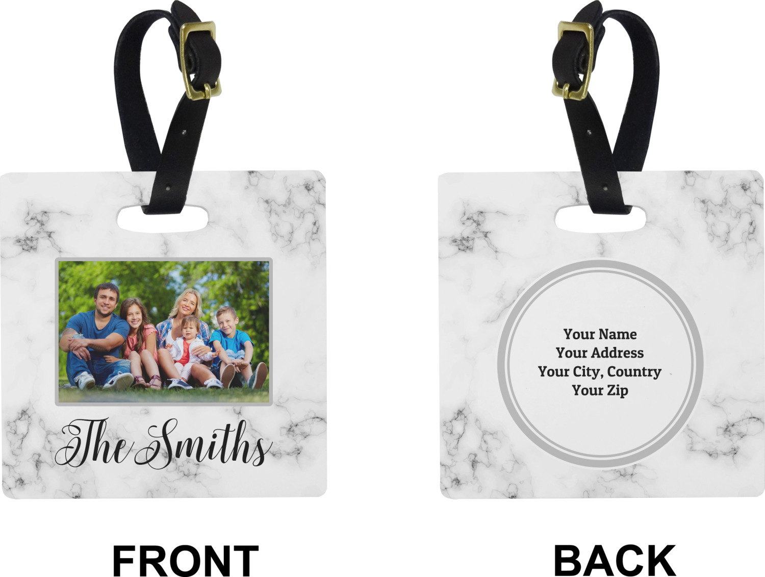 These personalized bag tags are sold in a variety of shapes, so that you may find the product that meets your vision exactly. We sell a round luggage tag, which measures at approximately 4" x 4". Our square luggage tag is about 3.5" x 3.5", while our rectangular version is 2.75" x 4 ".