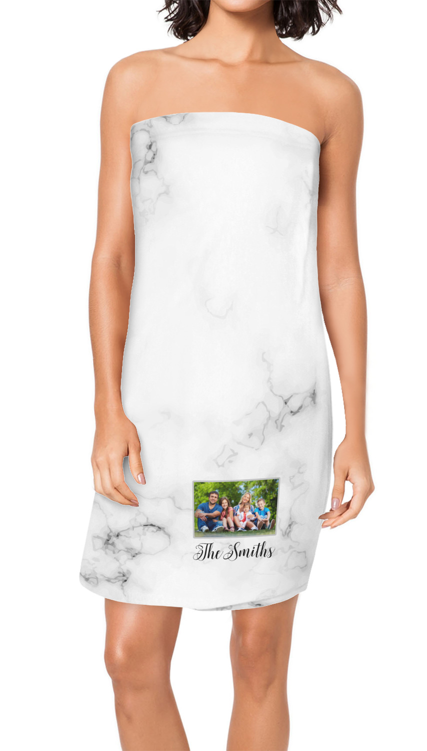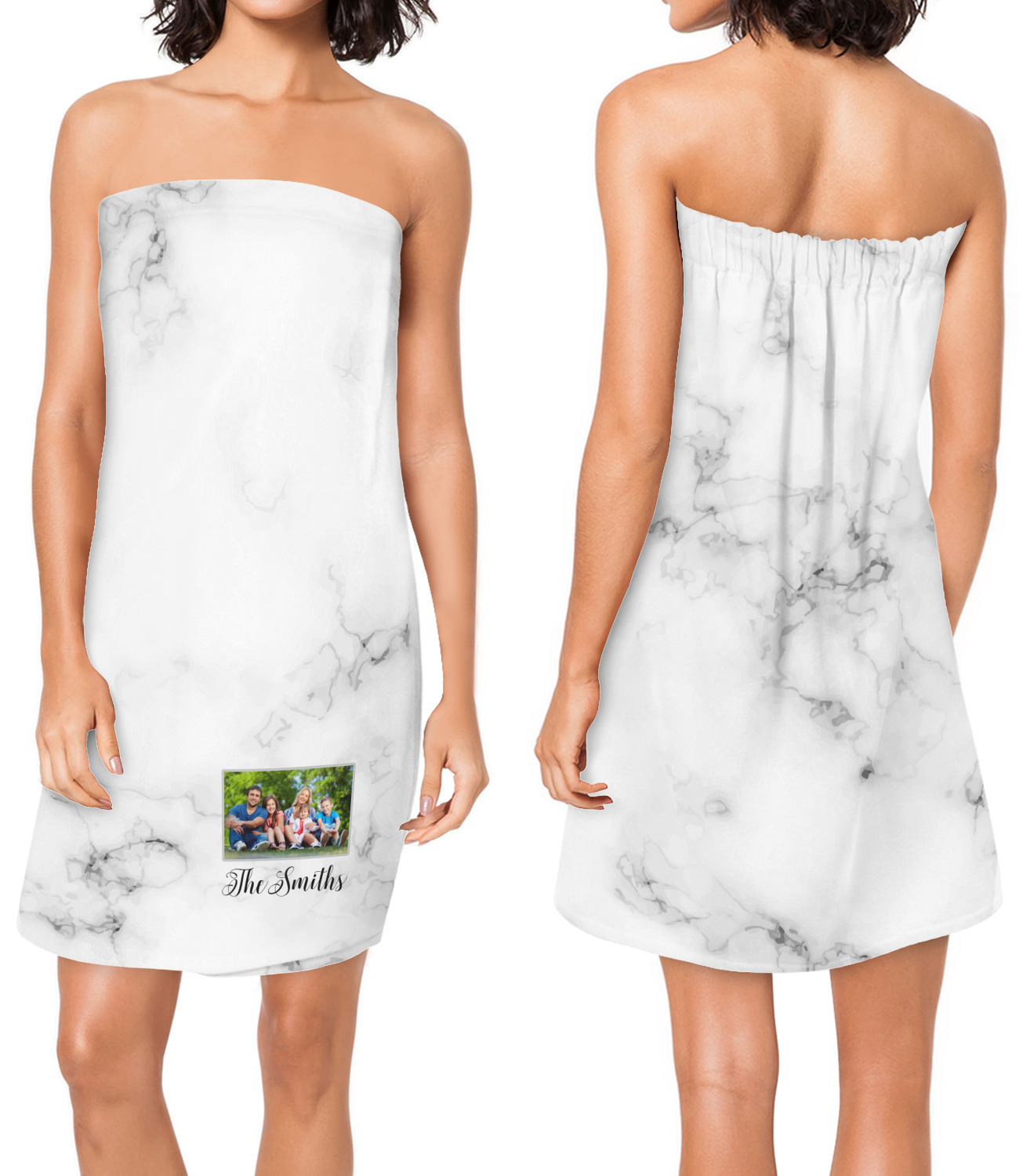 Made from a plush, fleece fabric, these luxurious towel wraps are comfortable and absorbent. They are printed, cut, and sewn for you, right here in the USA, after you place your order. These personalized bath wraps measure at approximately 59 by 32 inches, and display your customization across the outside.