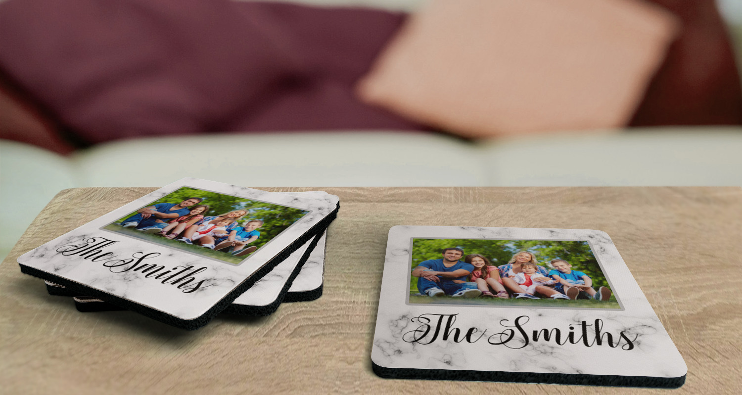 These drink coasters have a smooth, polyester top and a textured, rubber backing on its bottom. The non-slip rubber backing underneath works to keep any spills at bay. At 4 by 4 by 0.25 inches thick, these custom coasters are a suitable size for most drinkware. Your personalization is displayed atop the face of the cup coaster. We sell these rubber coasters in two different shapes: square and round. You can buy each shape as singulars or as a set of 4.