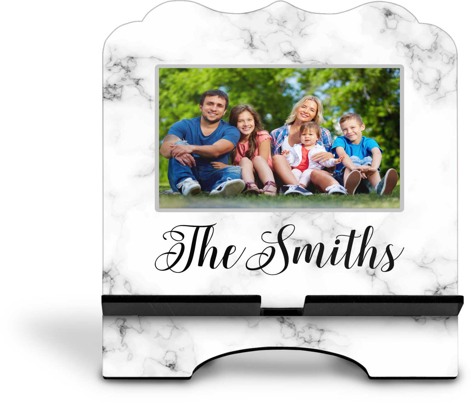 The stand is comprised of two hardboard pieces that fit snugly together and stabilize one another. The bottom part of the iPad stand supports your tablet, and has space for your tablets charger while in use. At 9.25" x 11.5", this tablet mount can support a device between the sizes of the iPad Pro and the iPad Mini 2. The uppermost part of the stand features a decorative, curved edge for a classy, suave appearance. We print your customization atop the face of the stand, in vibrant color. The remaining sides are colored a sleek black.