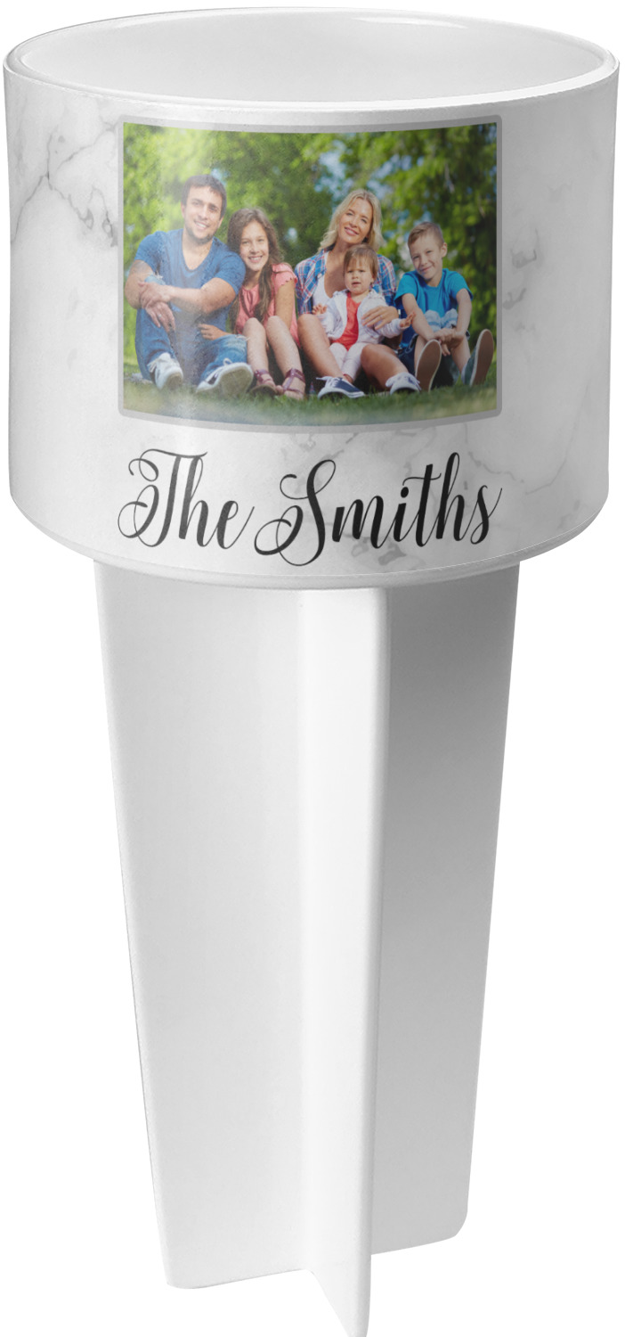 This cup holder has a large stake at its bottom that anchors it to the sand or ground below, while the cup holder rests above the stake. The entire drink holder is made of durable plastic and displays your customization around the cup holder portion. We sell these personalized beach spikers in two different colors: black and white.
