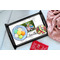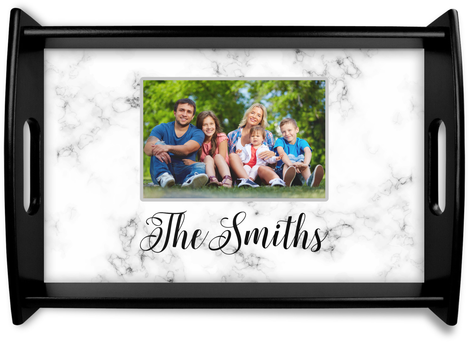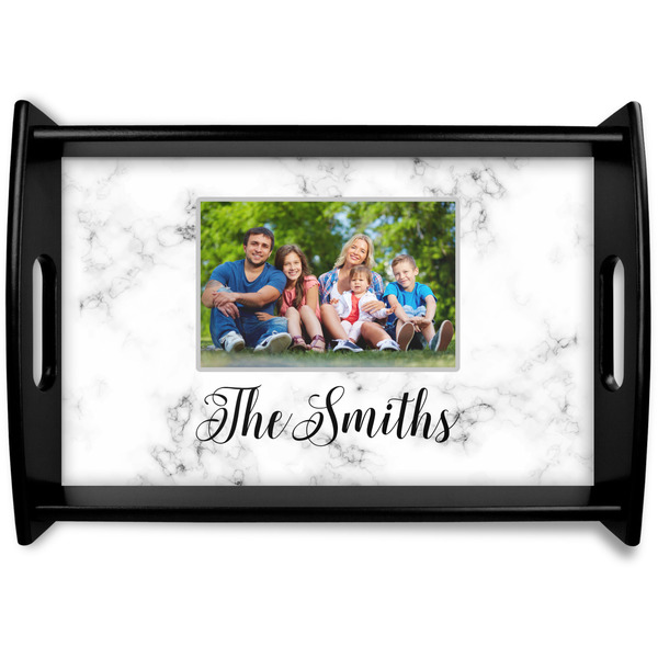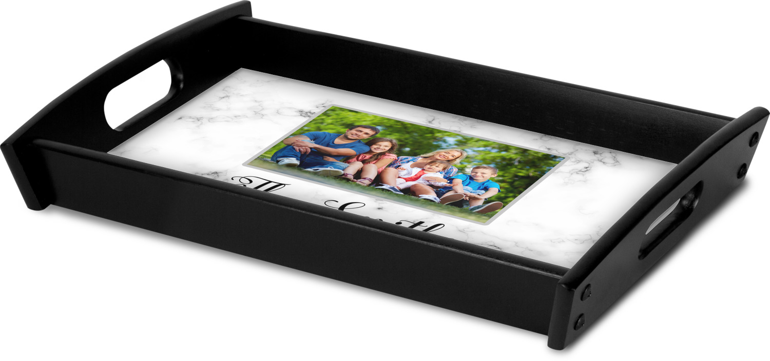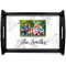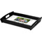 This serving tray with handles features square edges and two rounded sides, creating a very modern look. Each side is fabricated from a beautifully cut, natural wood. The bottom of the interior of the tray displays your customized design in bright, vibrant color. The tray is sold in both a black color and a natural wood look. Each variation of the wood serving tray has two sizes: Small, which is 14" x 10" x 2.25", and Large, which is 19.5" x 13.5" x 2.75".