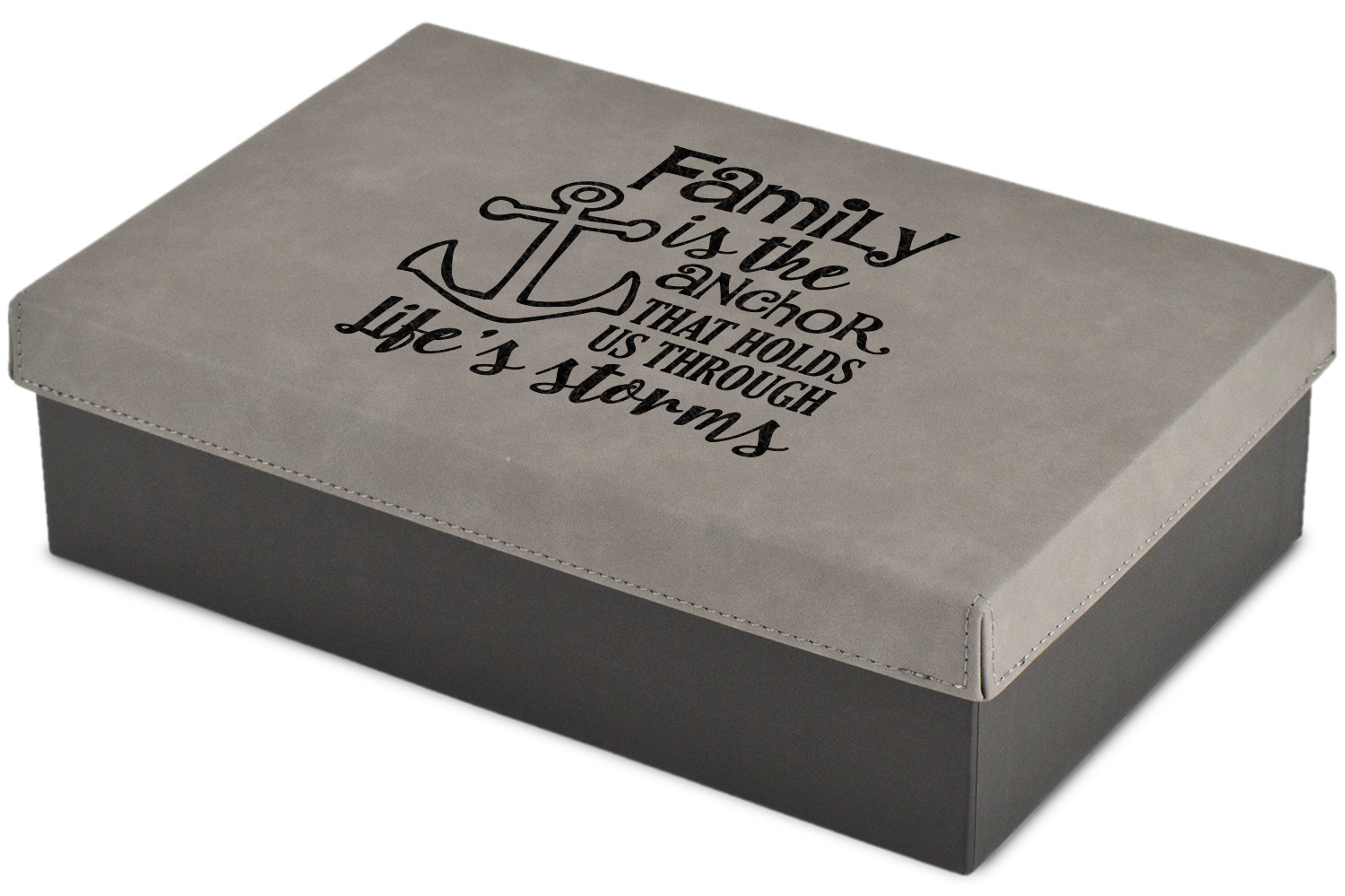 These gift boxes are available in 3 different sizes to accommodate various sized gifts. Available in gray as a neutral color for any occasion as well as to showcase your design boldly. Engraved with a laser this high quality paper board and faux leather gift box is unique and makes any gift stand out.