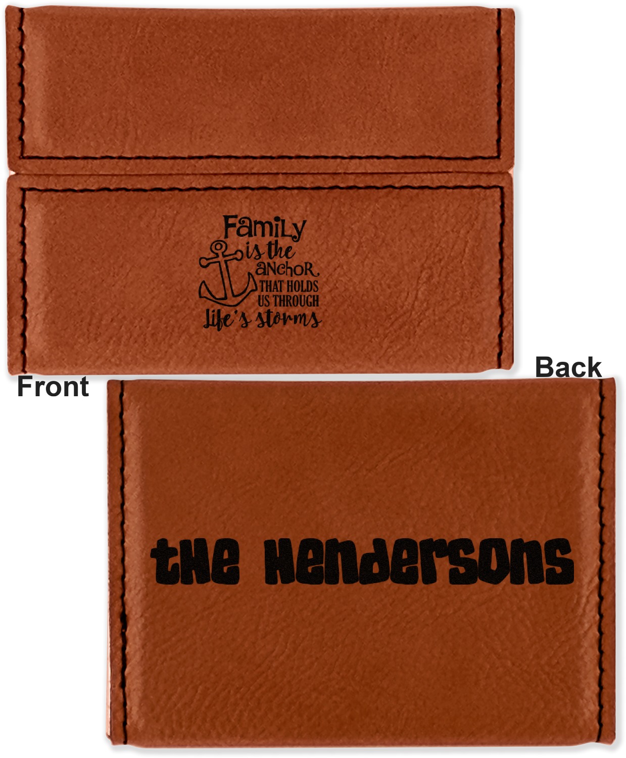 Your personalized design is laser engraved onto either the front, or the front and back of the card holder, depending on the model you purchase. Once engraved, the design will appear a darkened black against the cognac color of the leatherette.