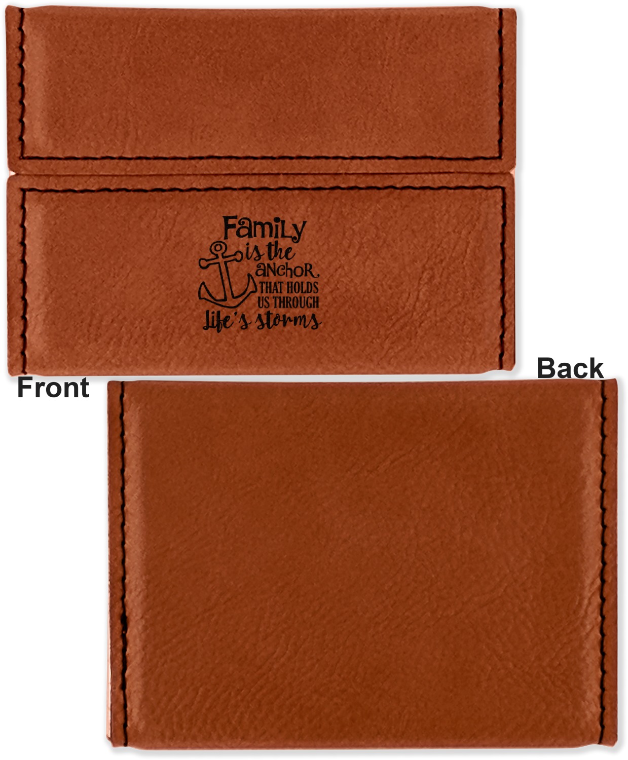 Your personalized design is laser engraved onto either the front, or the front and back of the card holder, depending on the model you purchase. Once engraved, the design will appear a darkened black against the cognac color of the leatherette.