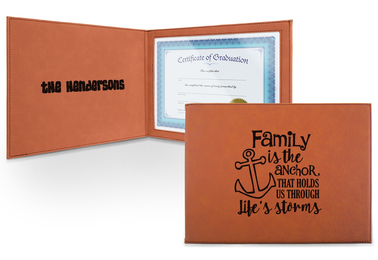 This cognac-colored, leatherette certificate jacket is the ideal way to display or store your hard-earned certificate. When closed, the custom certificate holder measures at 12 by 9 inches. The interior of the certificate cover includes a clear, vinyl window to encase your diploma. The window measures at around 10.5 by 7.5 inches and can accommodate a diploma that measures at up to 8.5 by 11 inches. You can either choose to have your customization laser engraved on the front and interior, or solely the front.