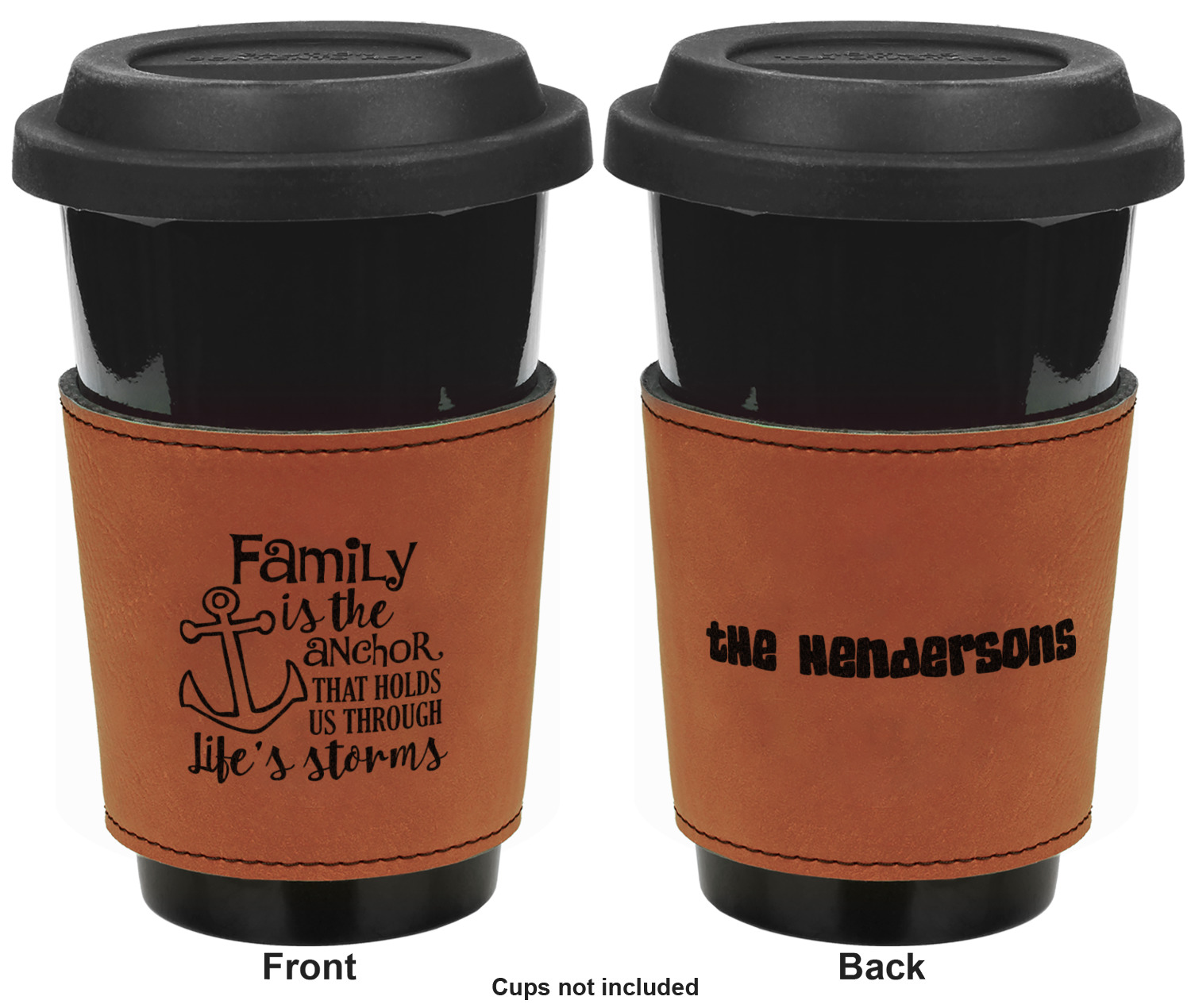 This cup sleeve is made from a suave, cognac-brown leatherette and finished with an intricate, black stitch. The interior of this can sleeve is fabricated from a thin foam material to help insulate your mug's contents. The sleeve is specifically made to suit tapered glasses or mugs, so the top's diameter is 3.5 inches, while the bottom's diameter is 2.75 inches. Your customized design will be laser engraved into the leatherette, leaving behind crisp, black imprint. With these products, we provide you with the option of engraving the front and back, or the front only.