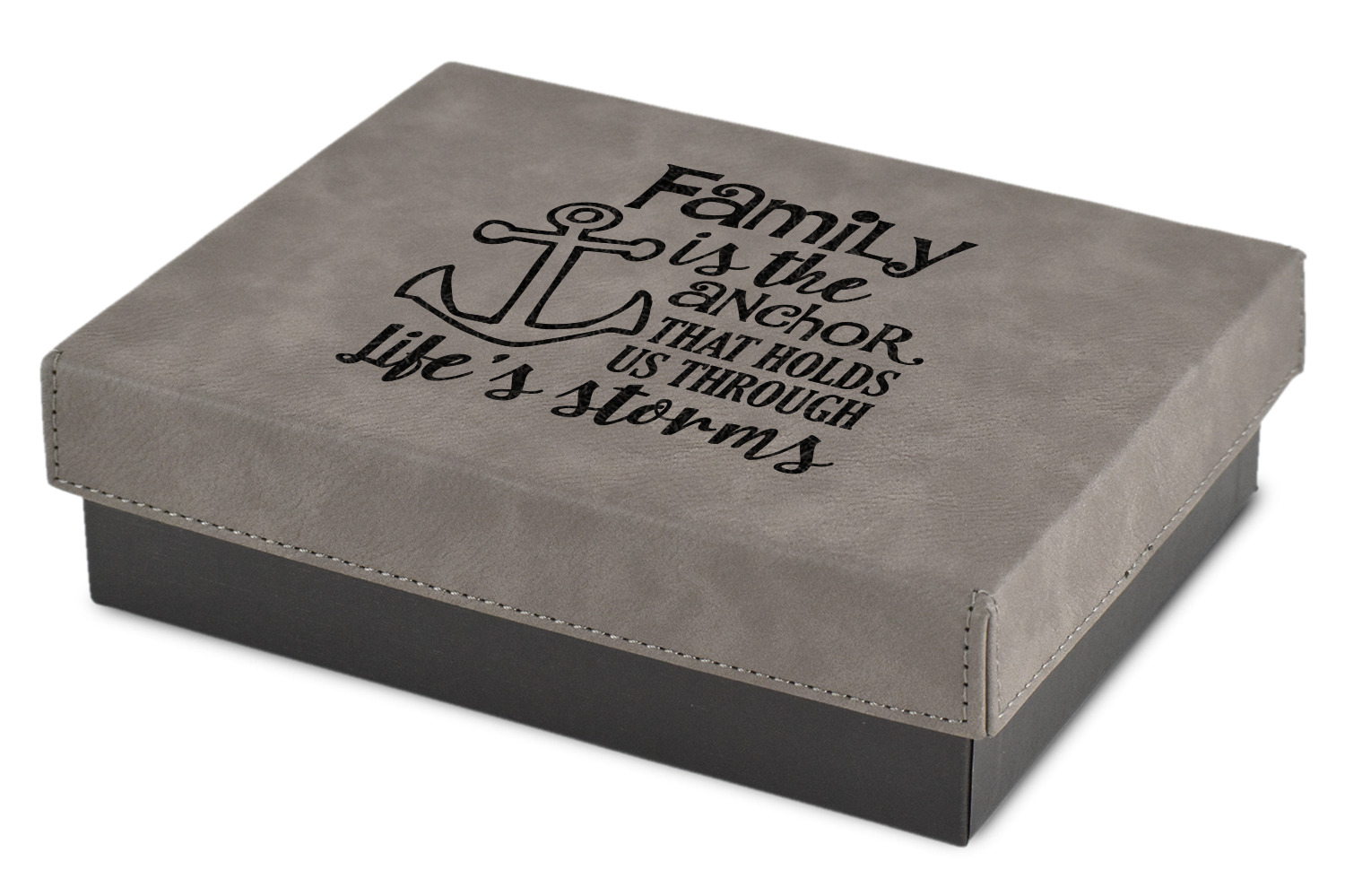 These gift boxes are available in 3 different sizes to accommodate various sized gifts. Available in gray as a neutral color for any occasion as well as to showcase your design boldly. Engraved with a laser this high quality paper board and faux leather gift box is unique and makes any gift stand out.