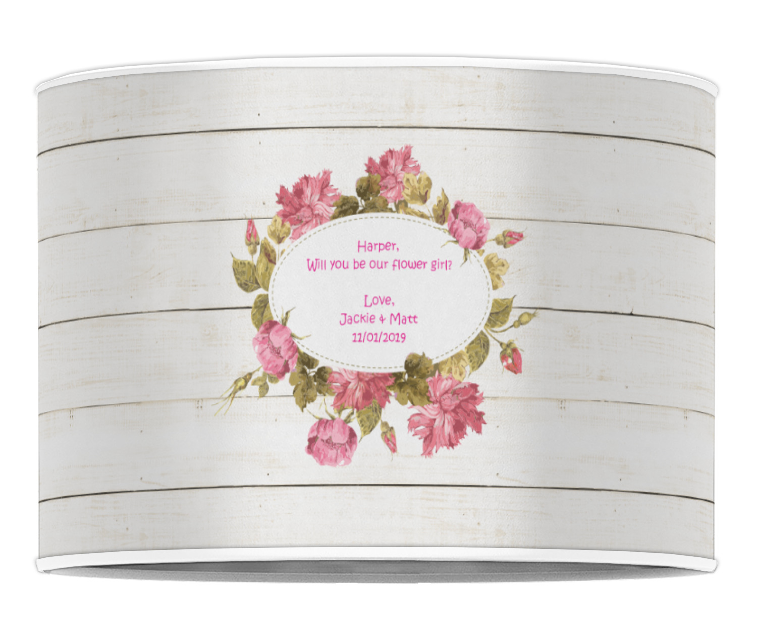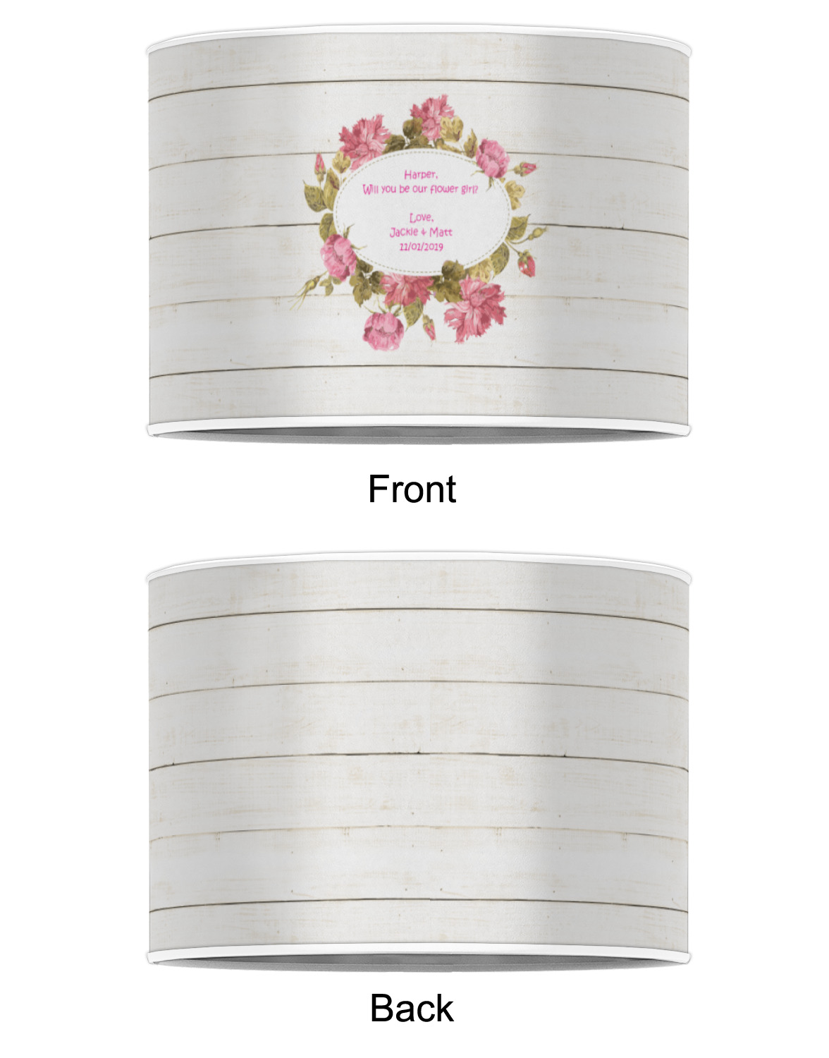 The main design has a background of weathered wooden planks. A beautiful light pink flower frame is used as the focal point of this design. The pink color of the frame and the personalization inside is the perfect contrast to the light colored wood.